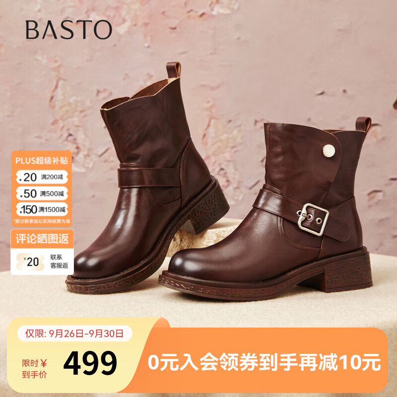 百思图2025冬季商场新款牛皮通勤粗跟扣带骑士靴女短靴W1120DD5 棕色 37
