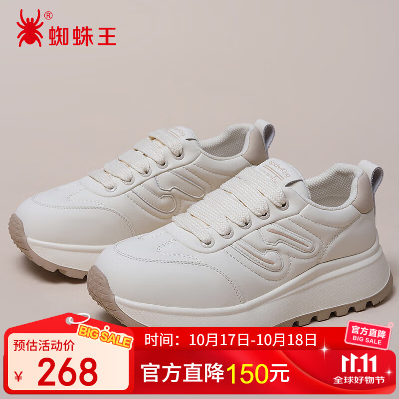 蜘蛛王休闲鞋女秋季厚底时尚面包鞋女舒适软底中老年妈妈鞋 米色 34