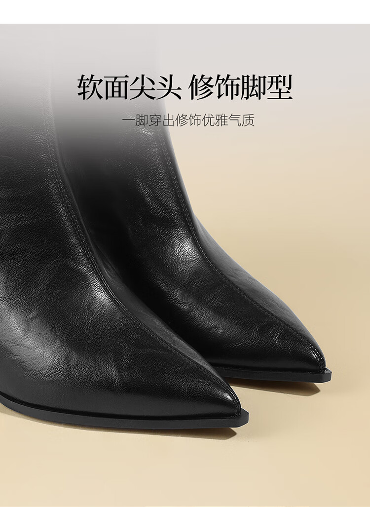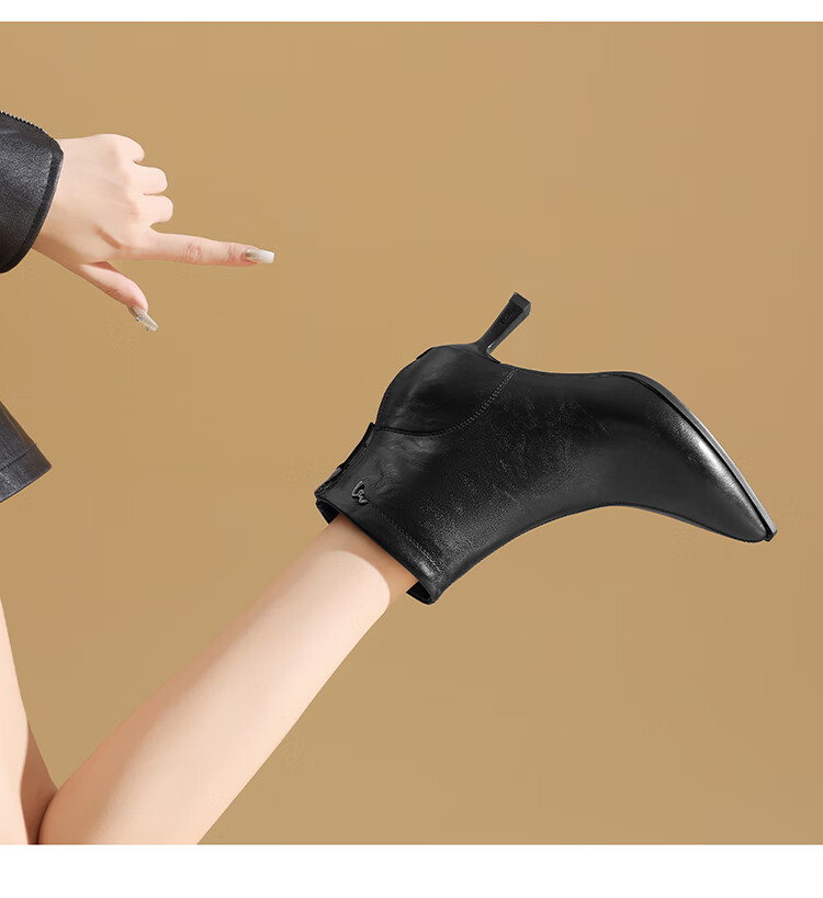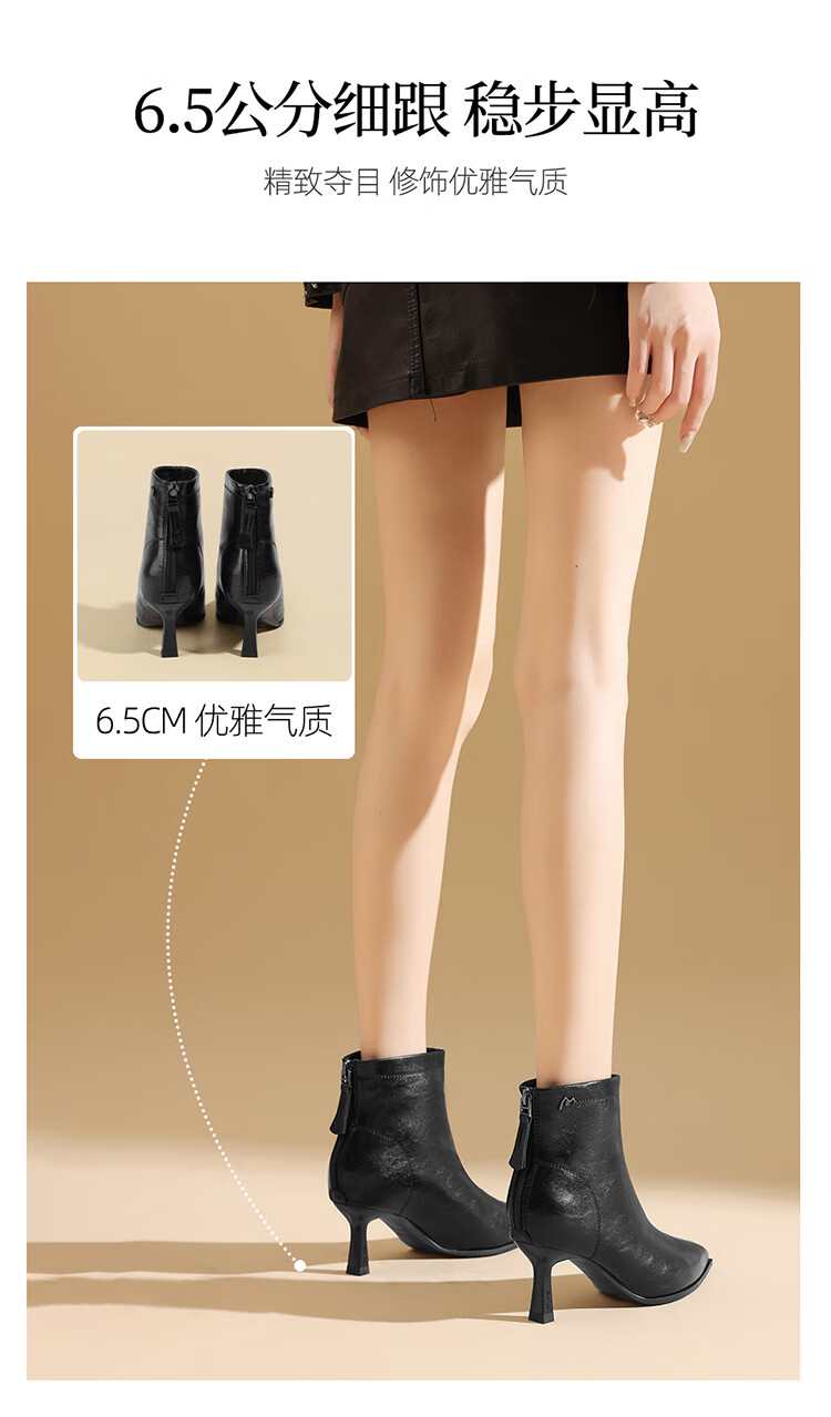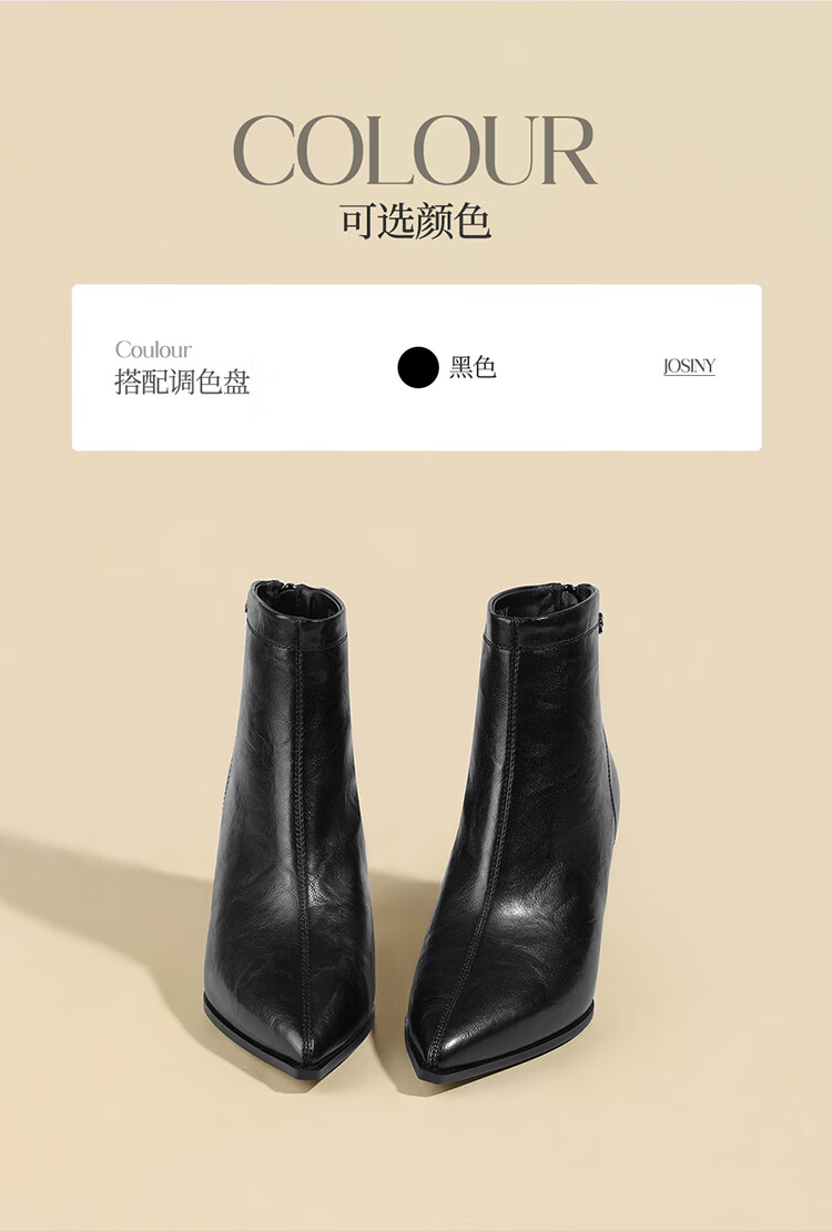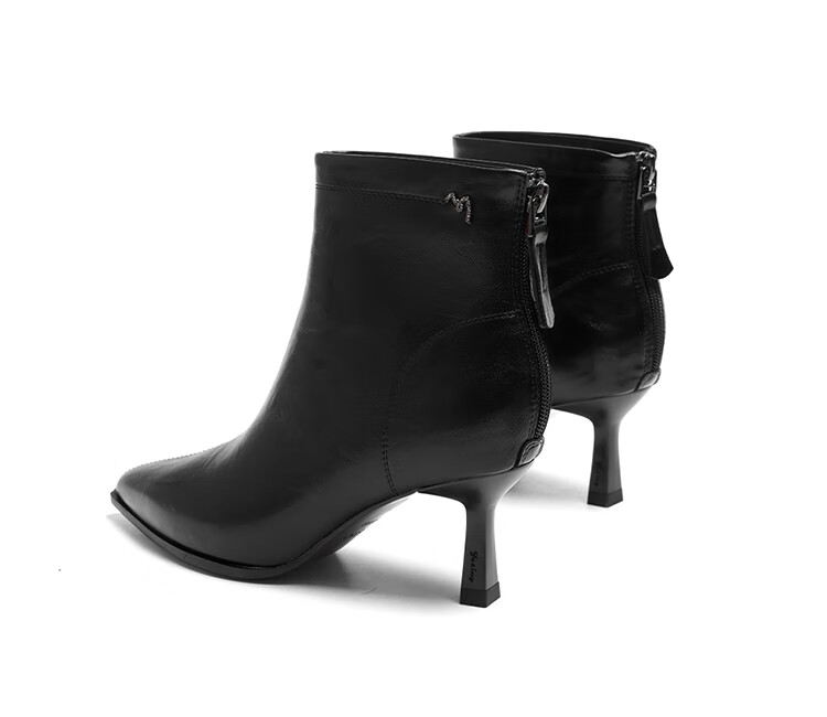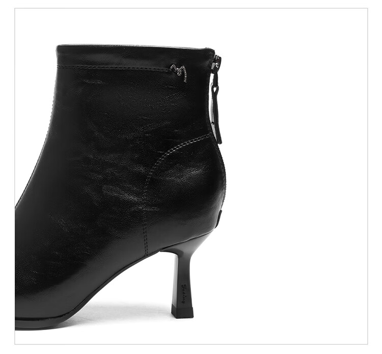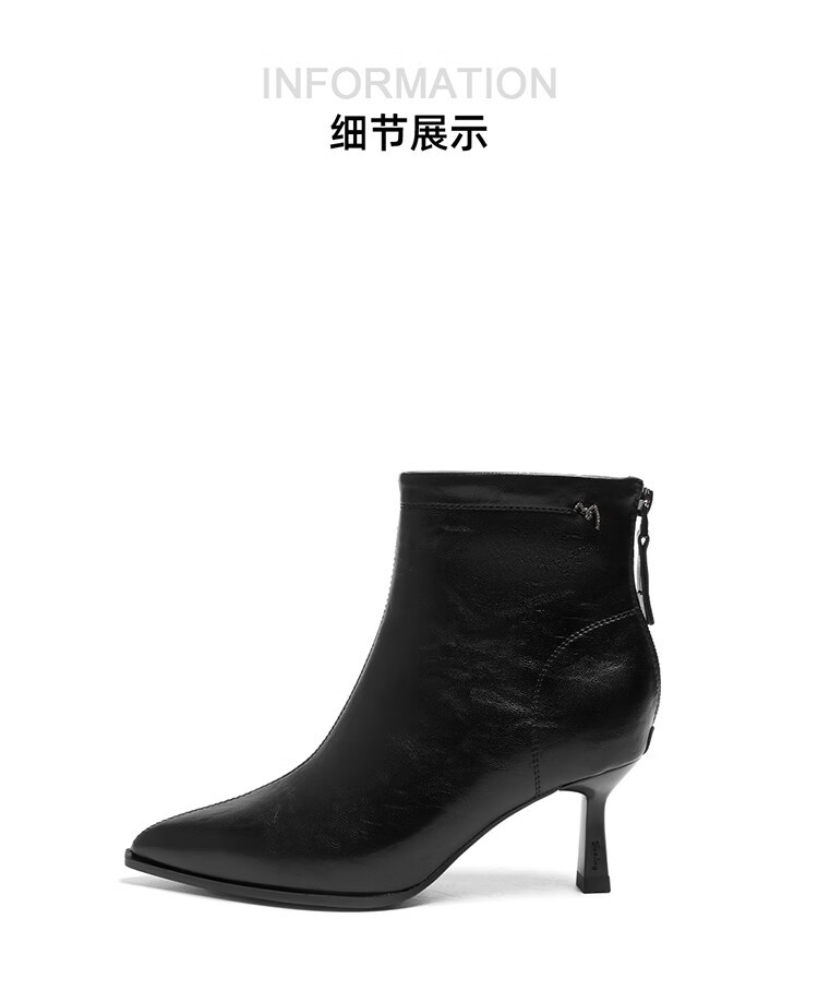卓诗尼高跟短靴女2025新款时尚休闲细跟后拉链黑色尖头时装靴 黑色 37