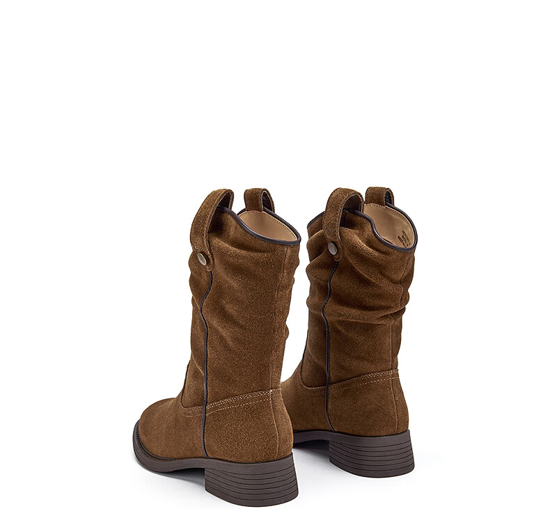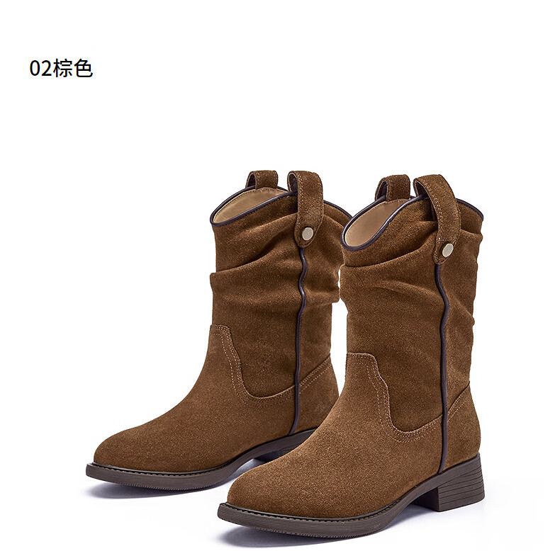 热风西部堆堆靴女2025年冬季新款棕色复古短靴百搭尖头靴子女鞋 02棕色 35