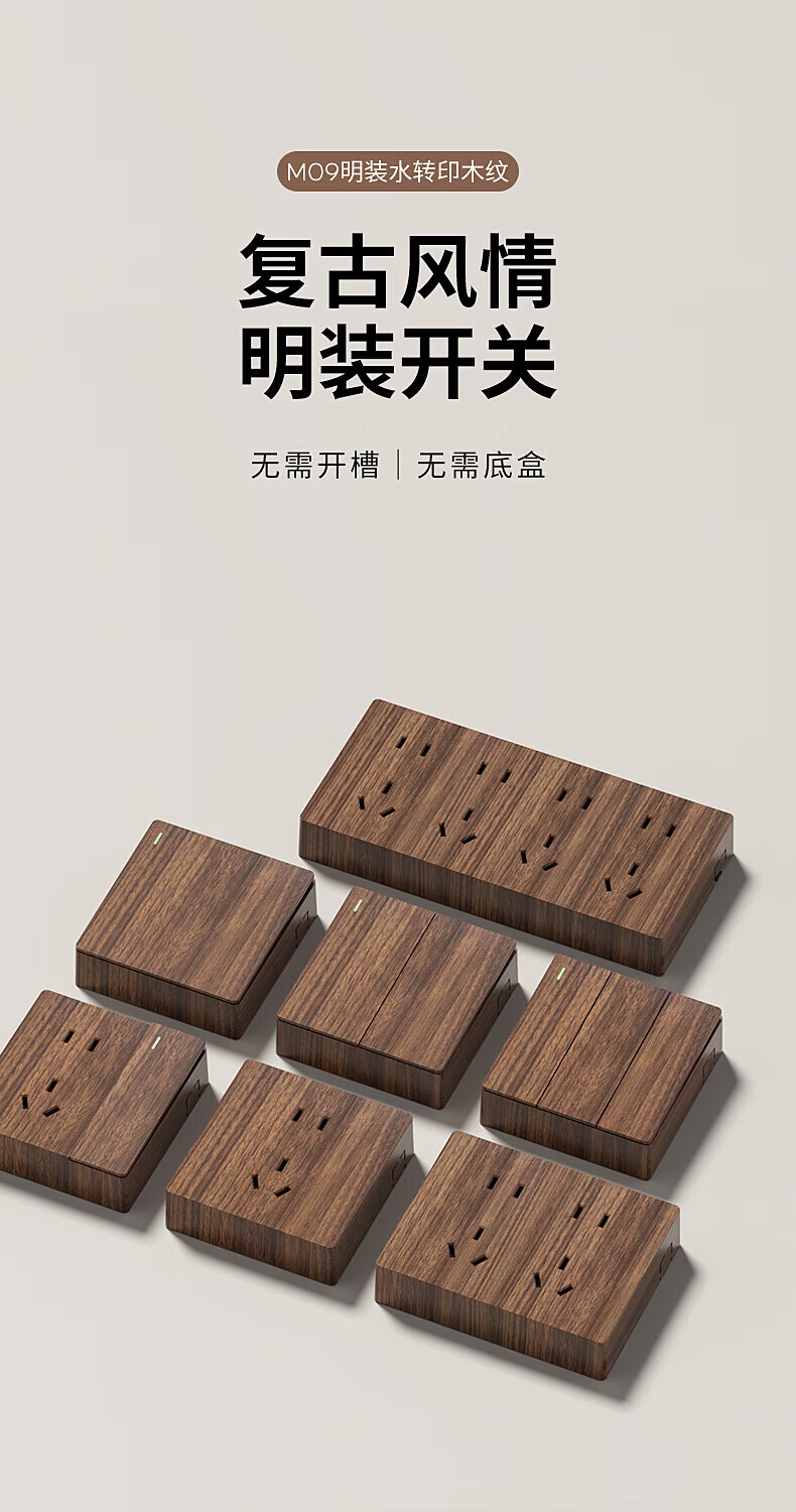 国际电工86型开关插座复古新中式面板民宿仿胡桃木纹墙壁插座明装一开五孔 五孔插座
