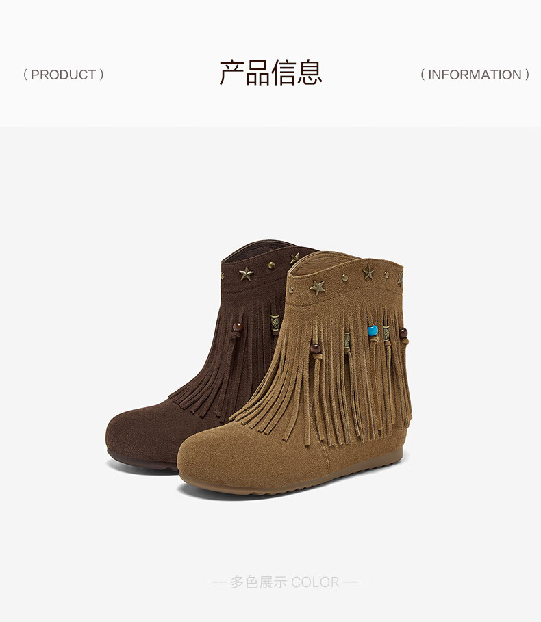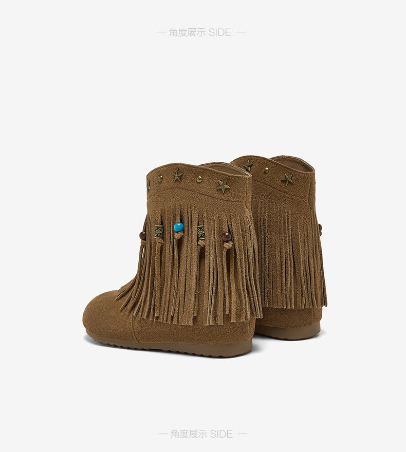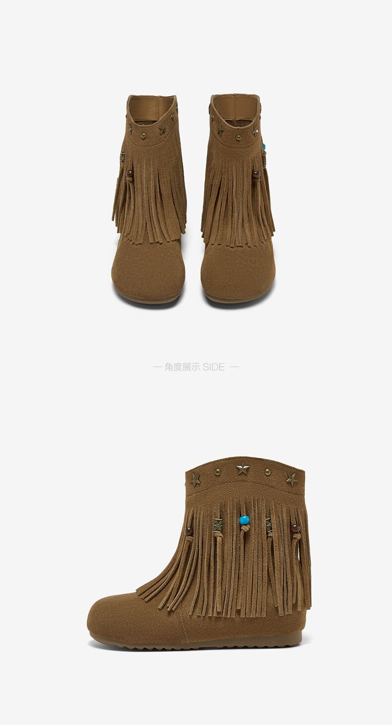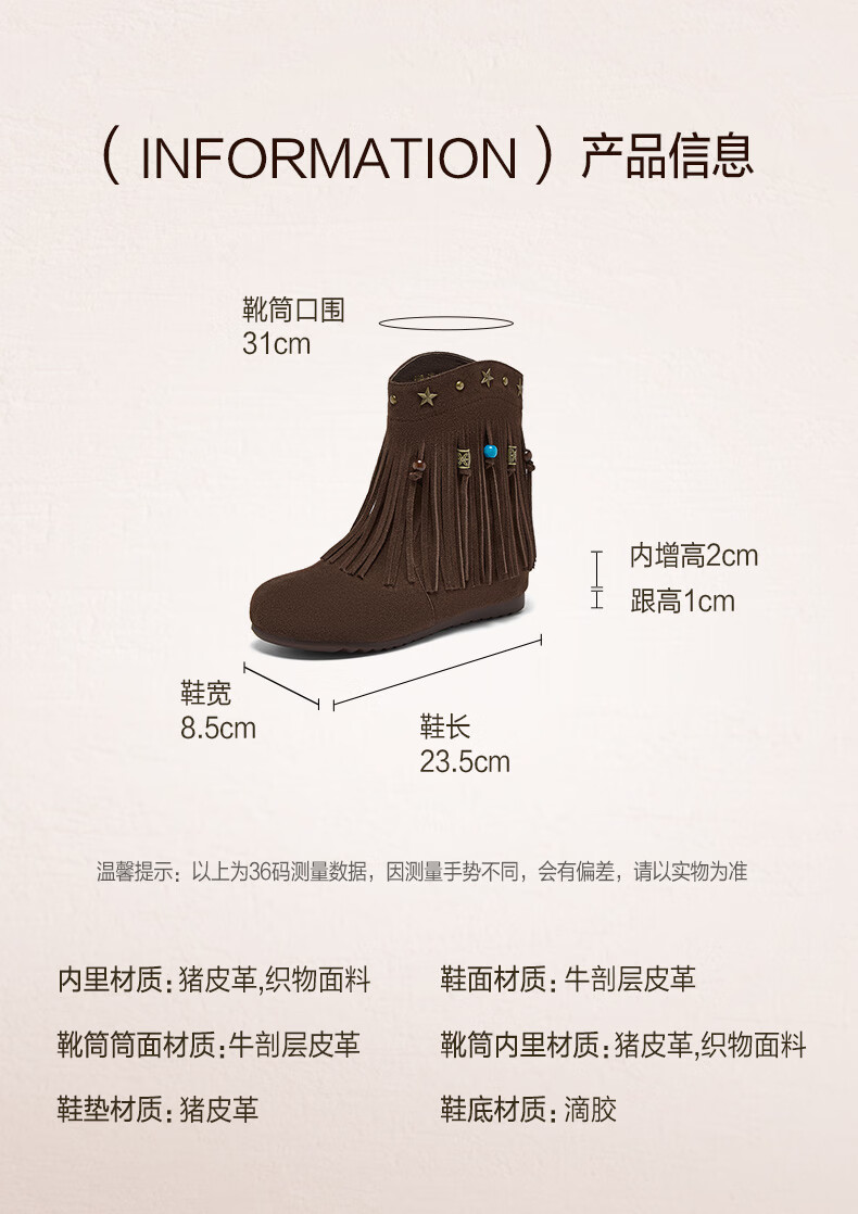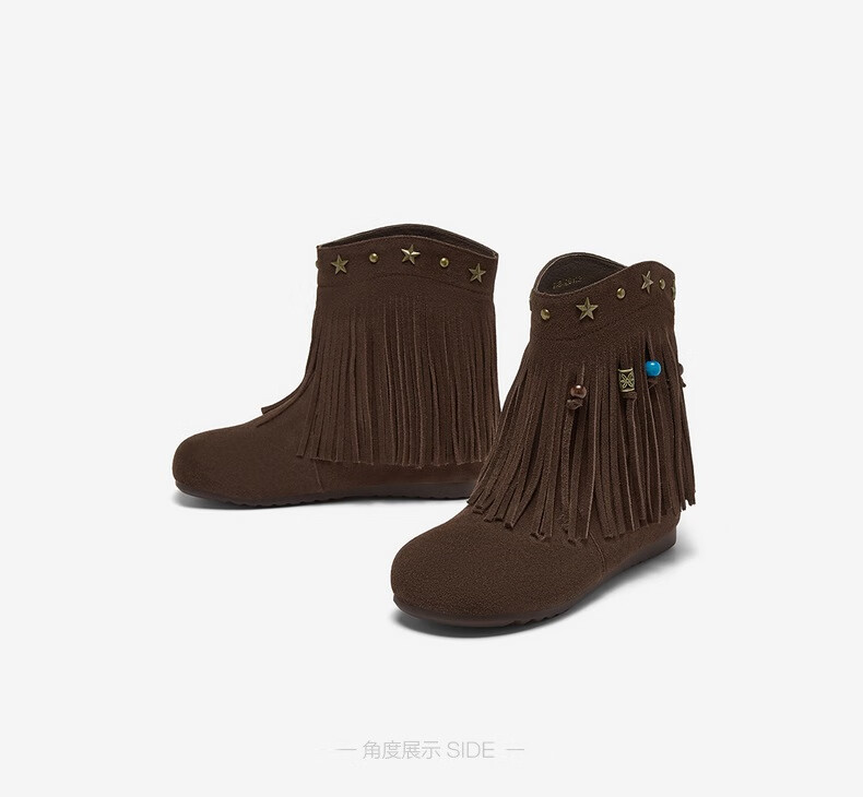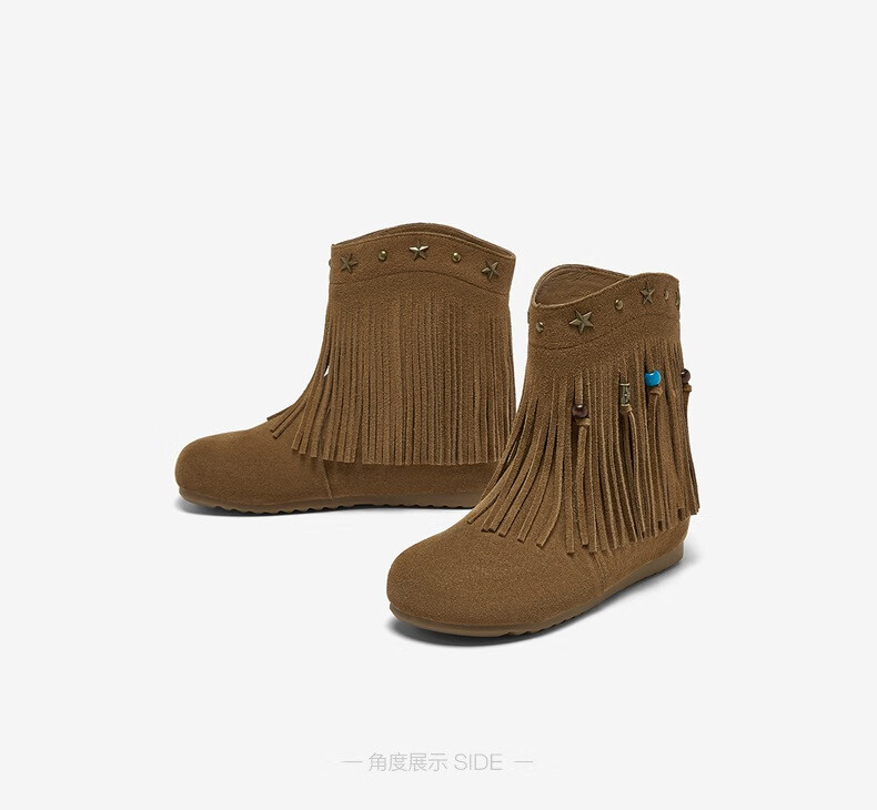 百思图2025冬新款时尚潮酷真皮流苏西部靴复古平底女短靴K5015DZ5 卡其色 34