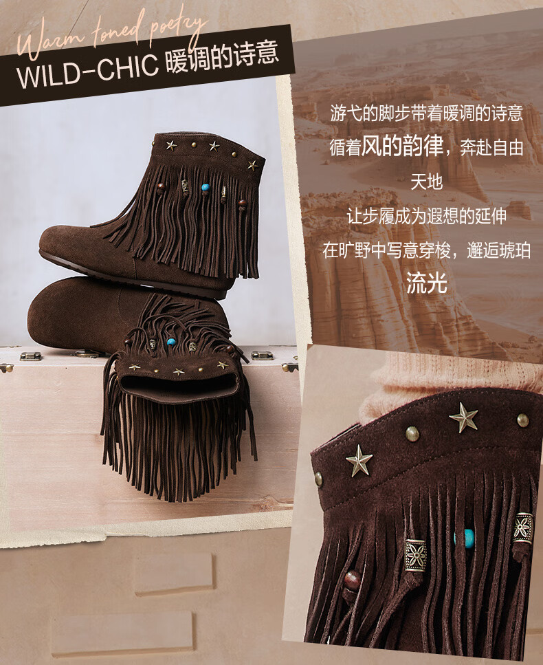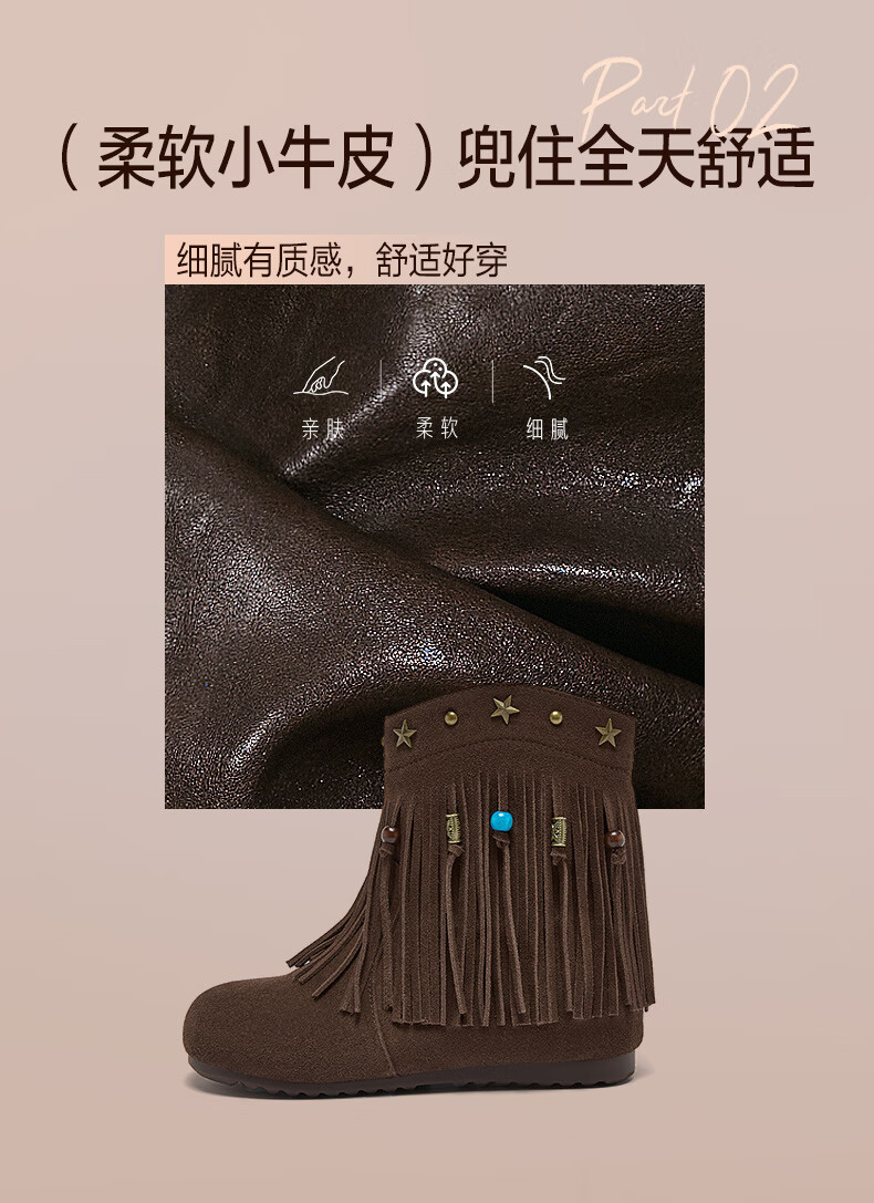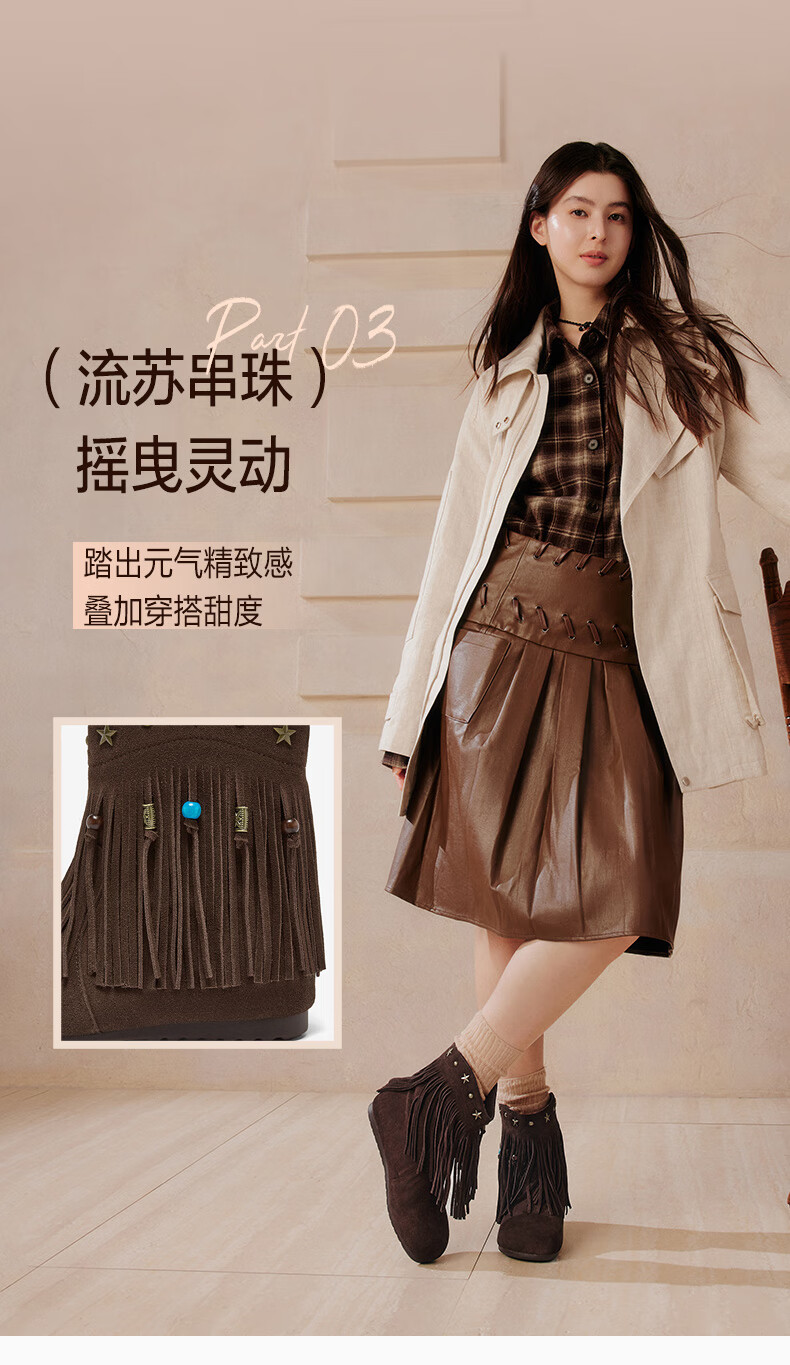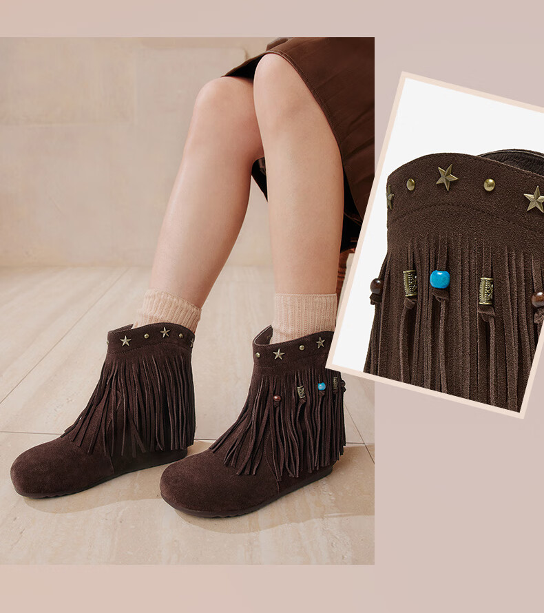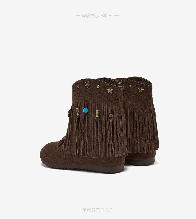 百思图2025冬新款时尚潮酷真皮流苏西部靴复古平底女短靴K5015DZ5 卡其色 34