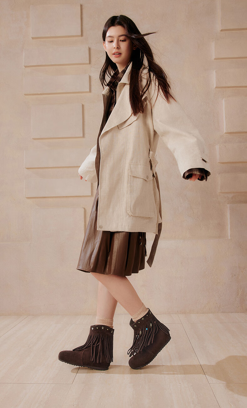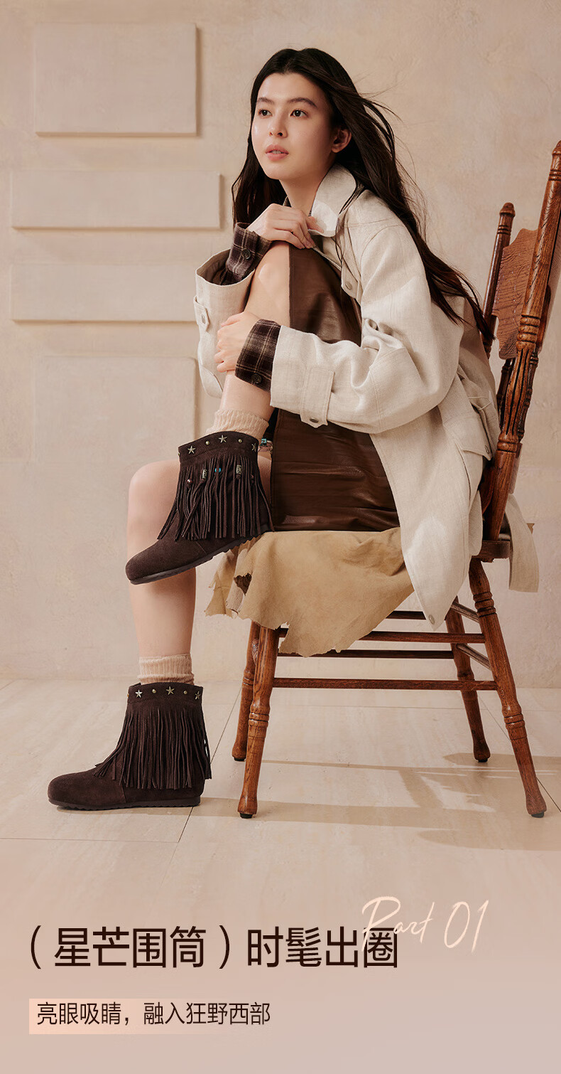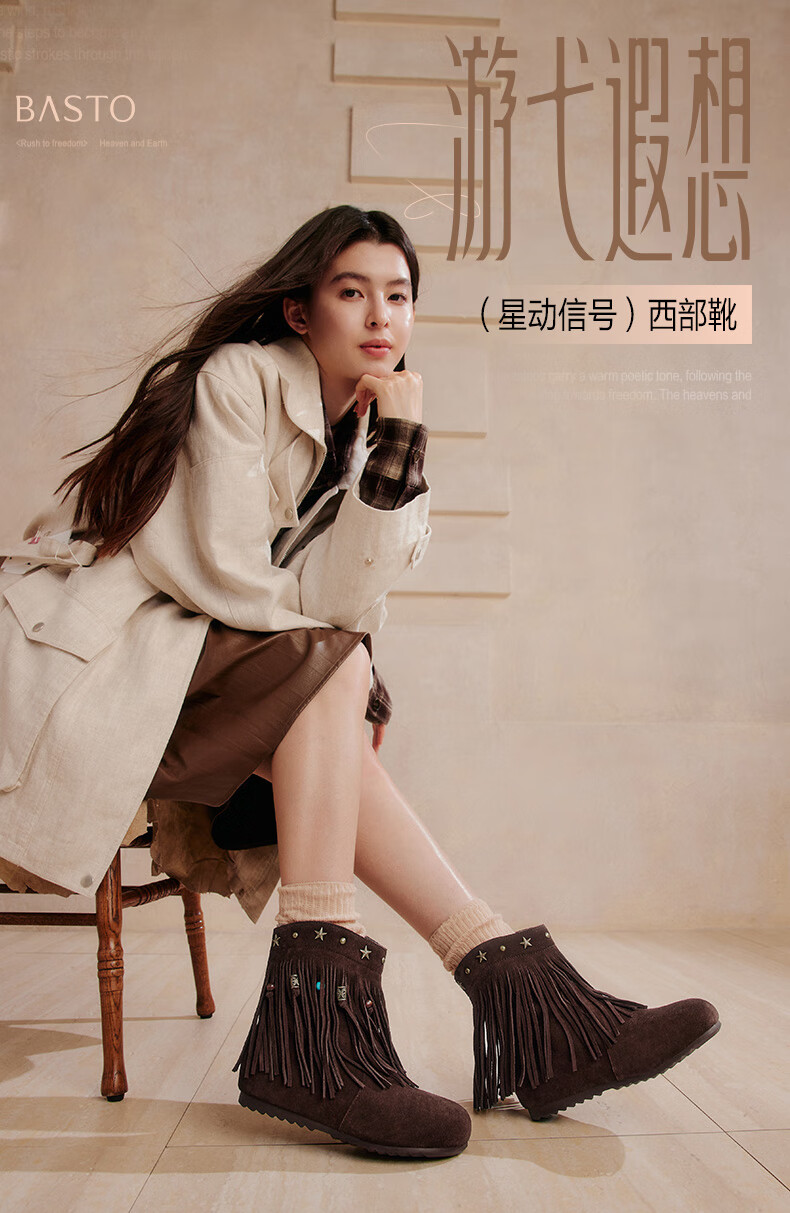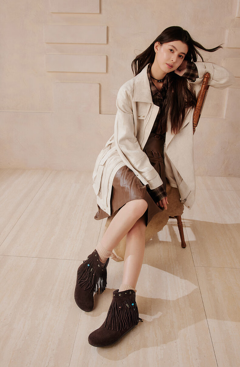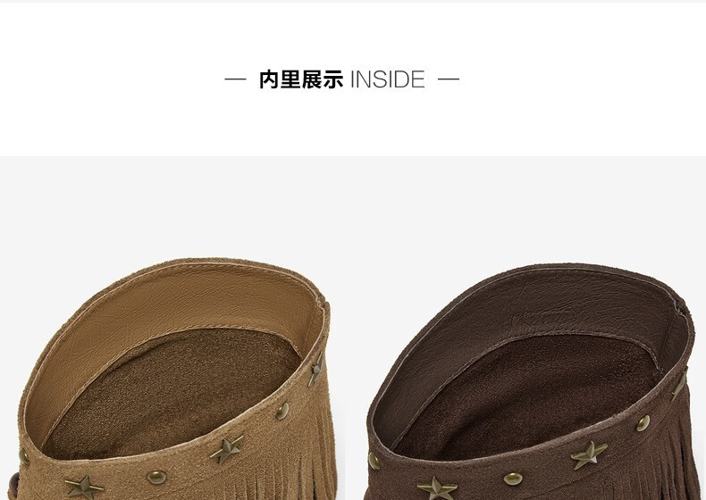 百思图2025冬新款时尚潮酷真皮流苏西部靴复古平底女短靴K5015DZ5 卡其色 34