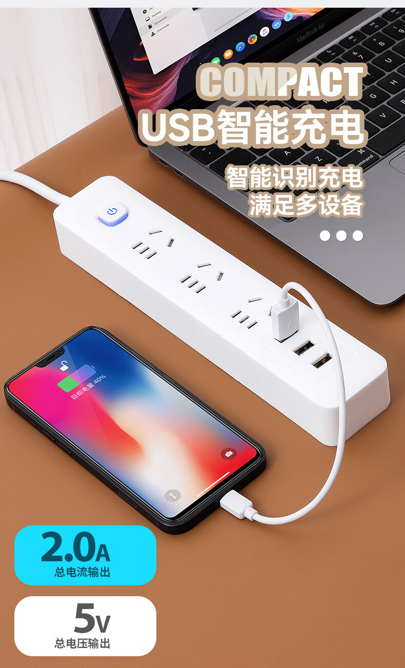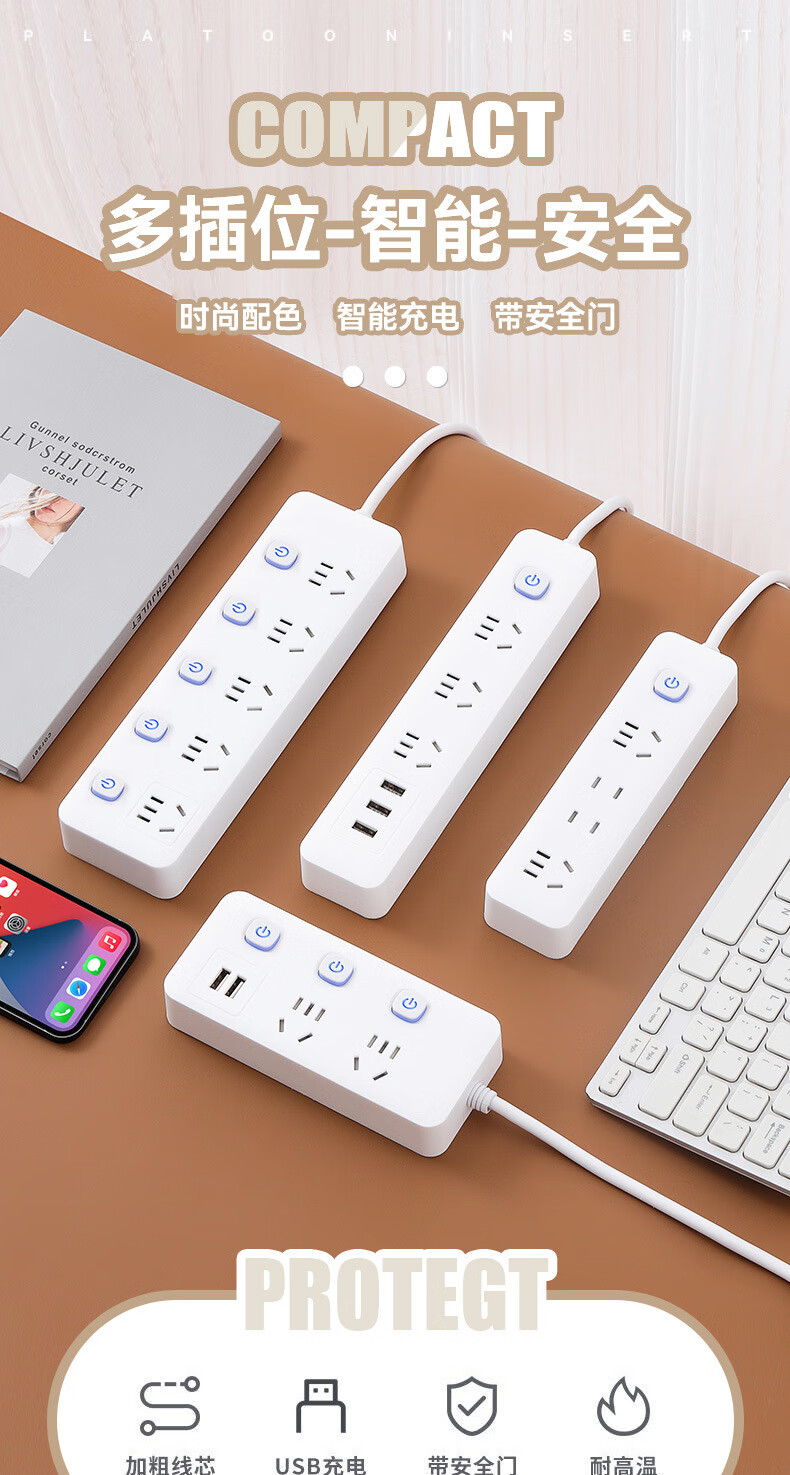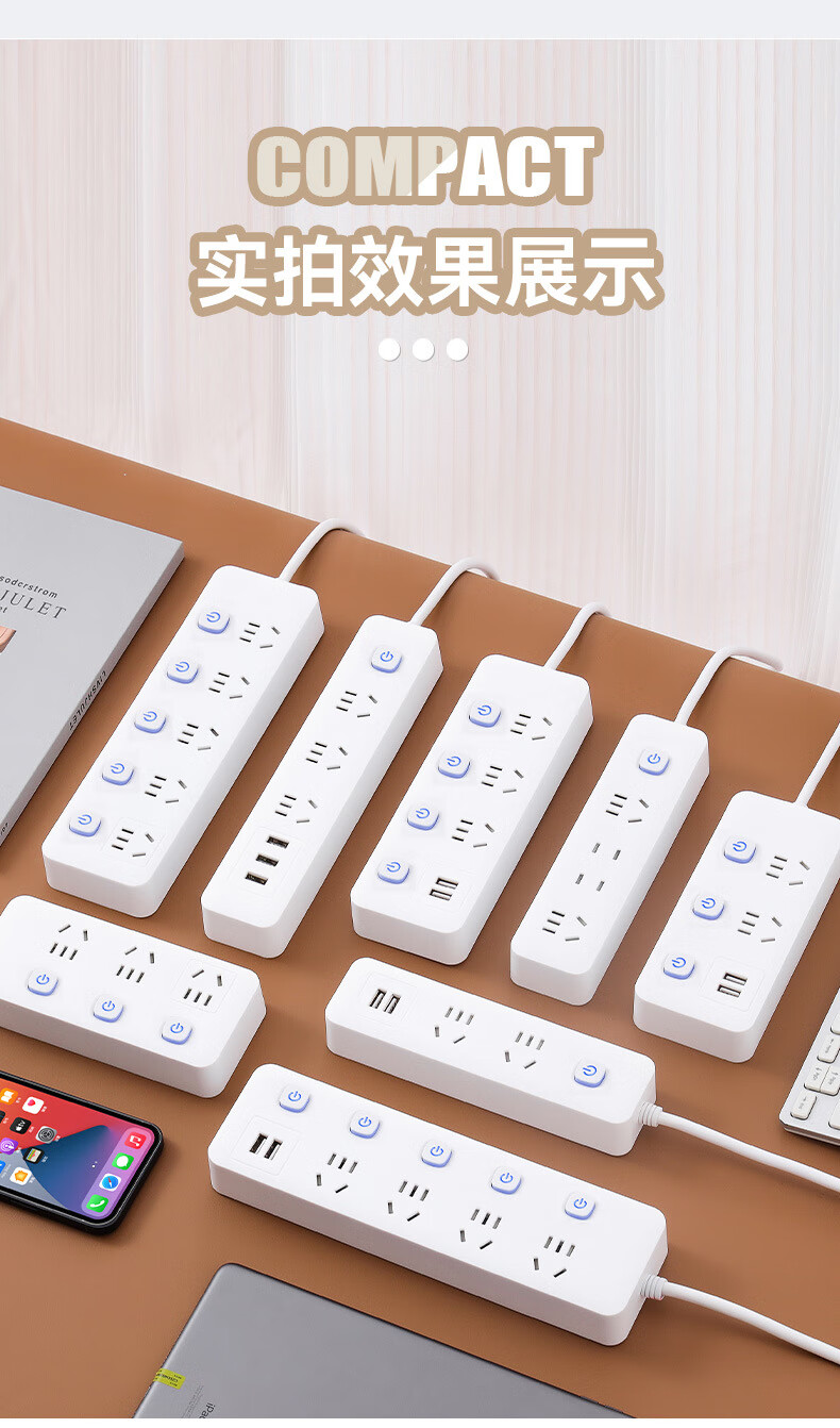 【优选】多功能usb插座面板多孔带线家用插排插板接线板插线板转 小白7孔【0.8米】 7孔