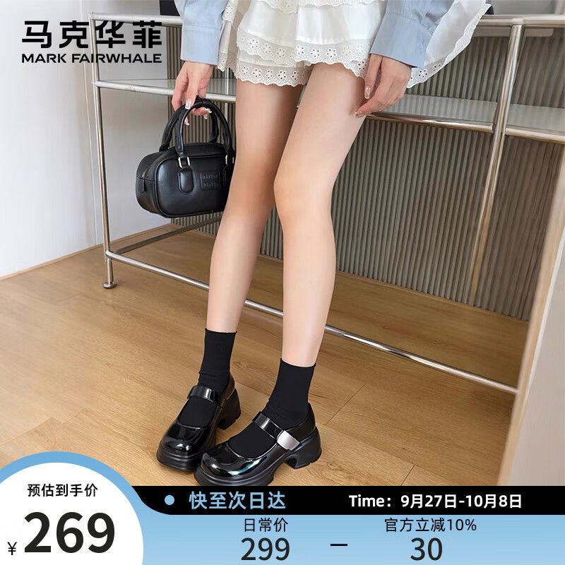 马克华菲厚底玛丽珍单鞋女2025夏季新款透气增高黑色小皮鞋 黑色 39