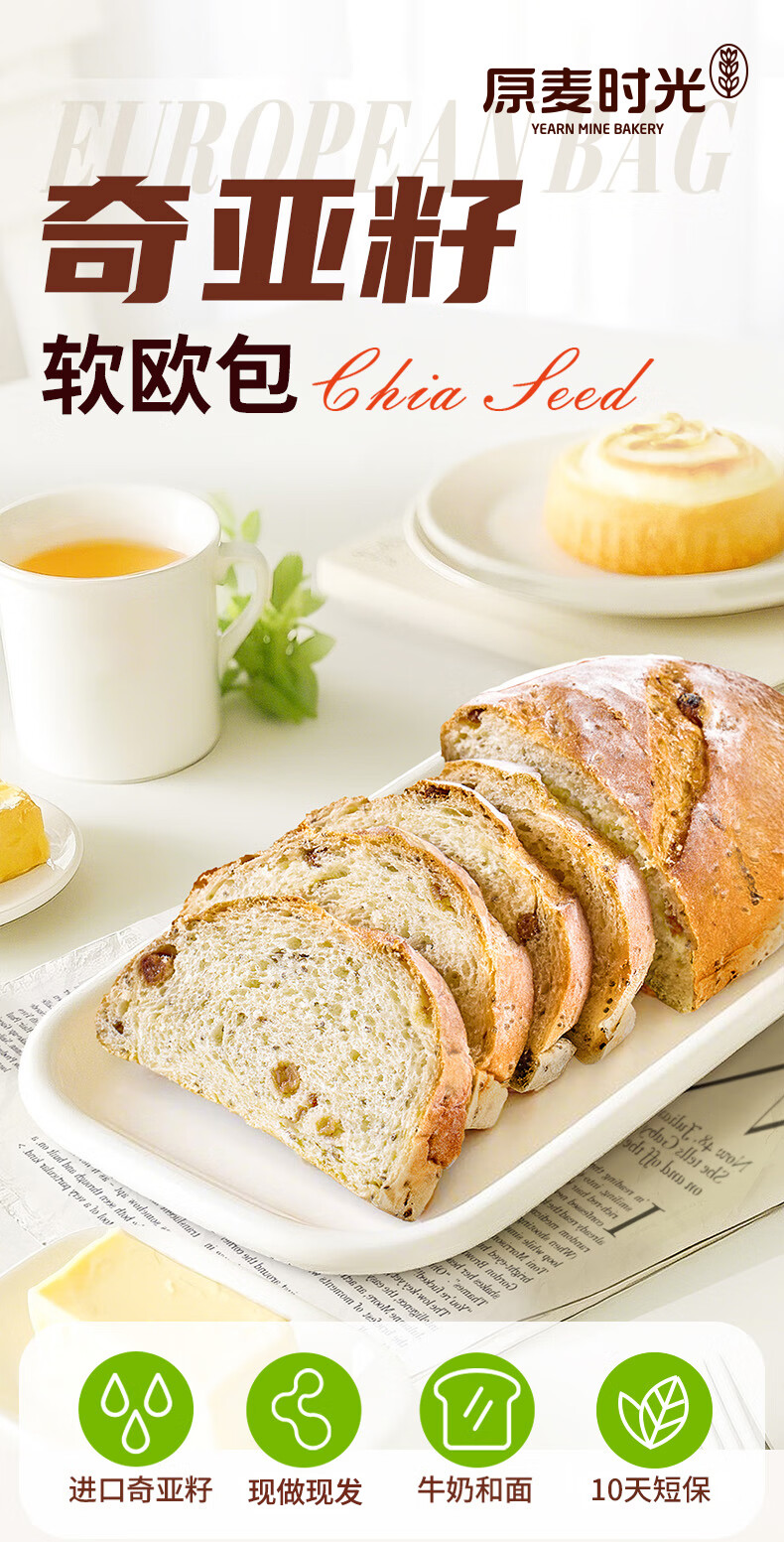 原麦时光奇亚籽软欧包早餐代餐0添加蔗糖休闲零食糕点240gx2袋源头直发