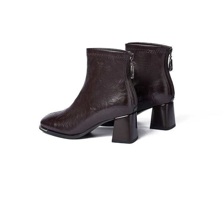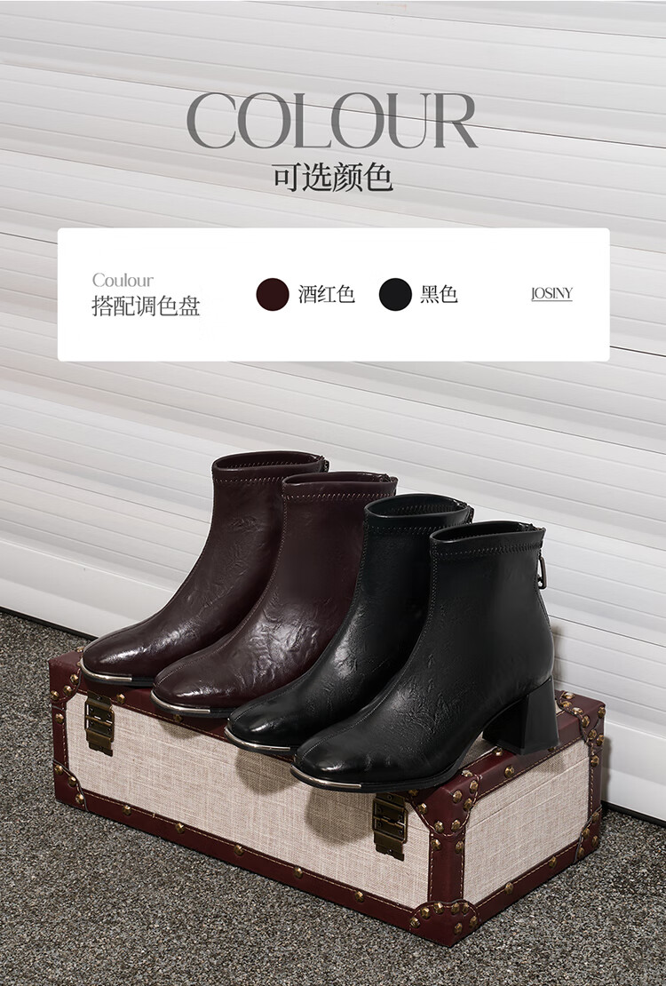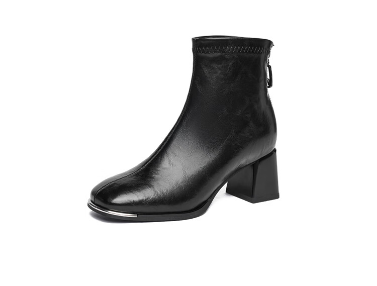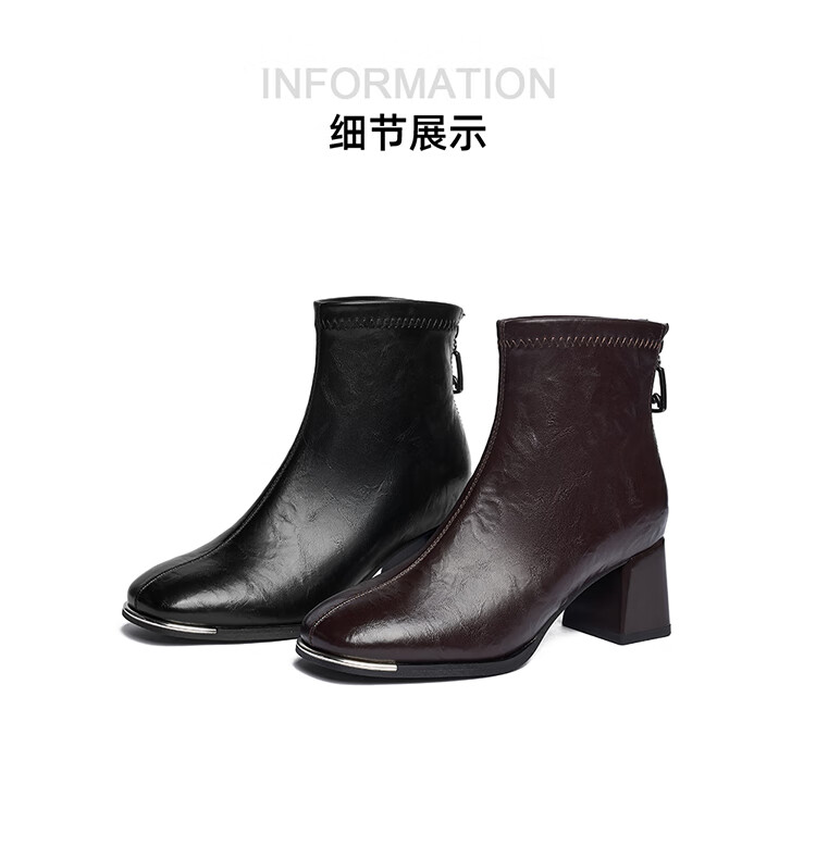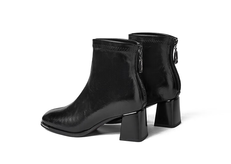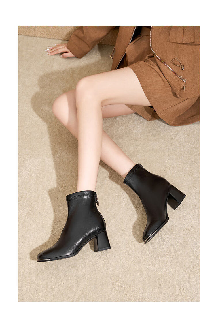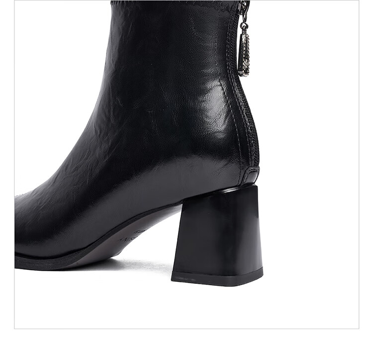 卓诗尼高跟短靴女2025新款时尚休闲细跟后拉链黑色尖头时装靴 黑色 39