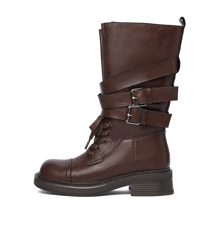 卓诗尼英伦风皮带扣骑士靴2025新款冬圆头系带套筒中筒靴马丁靴 黑色 37