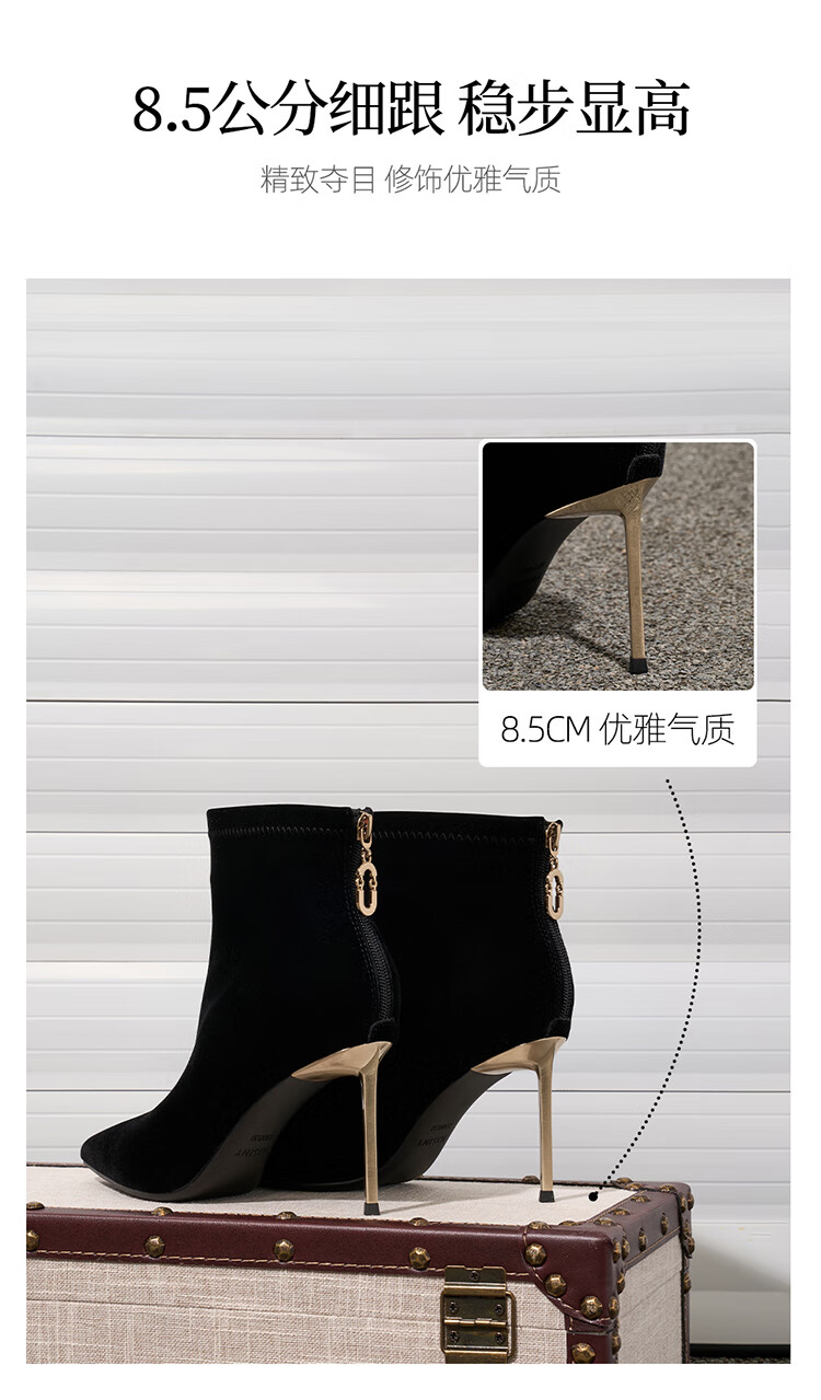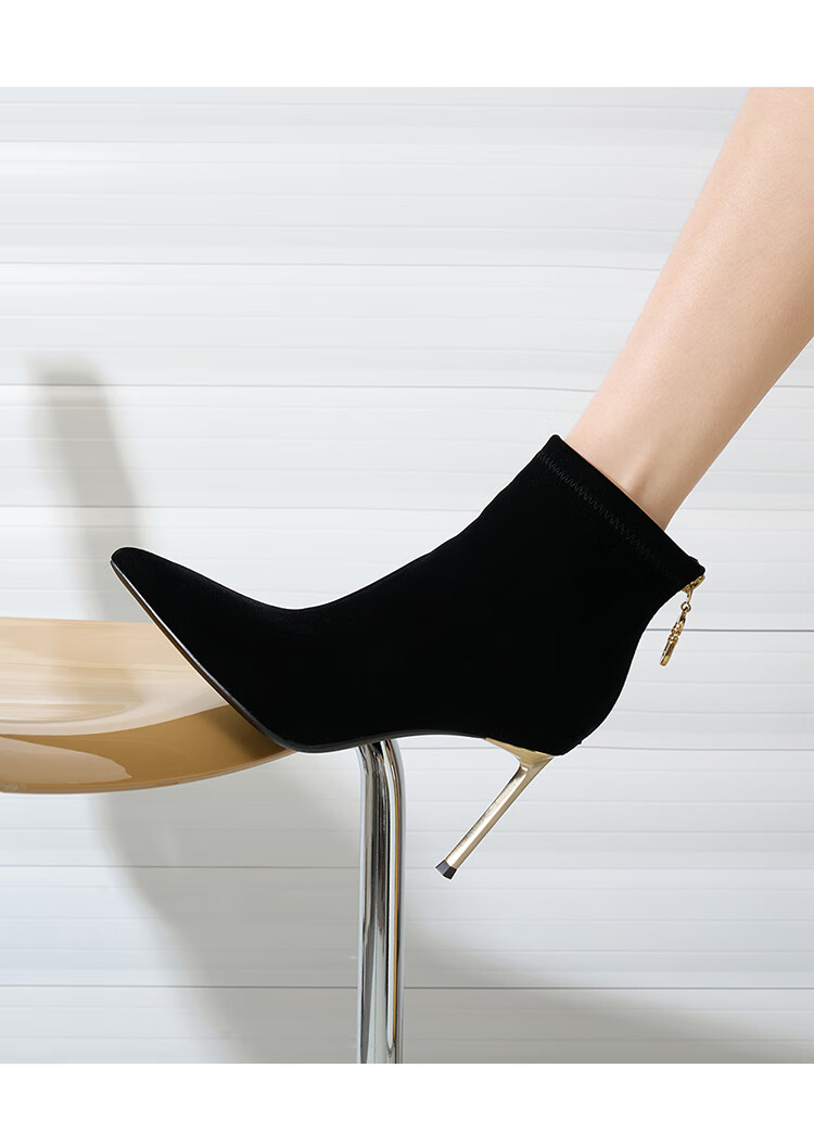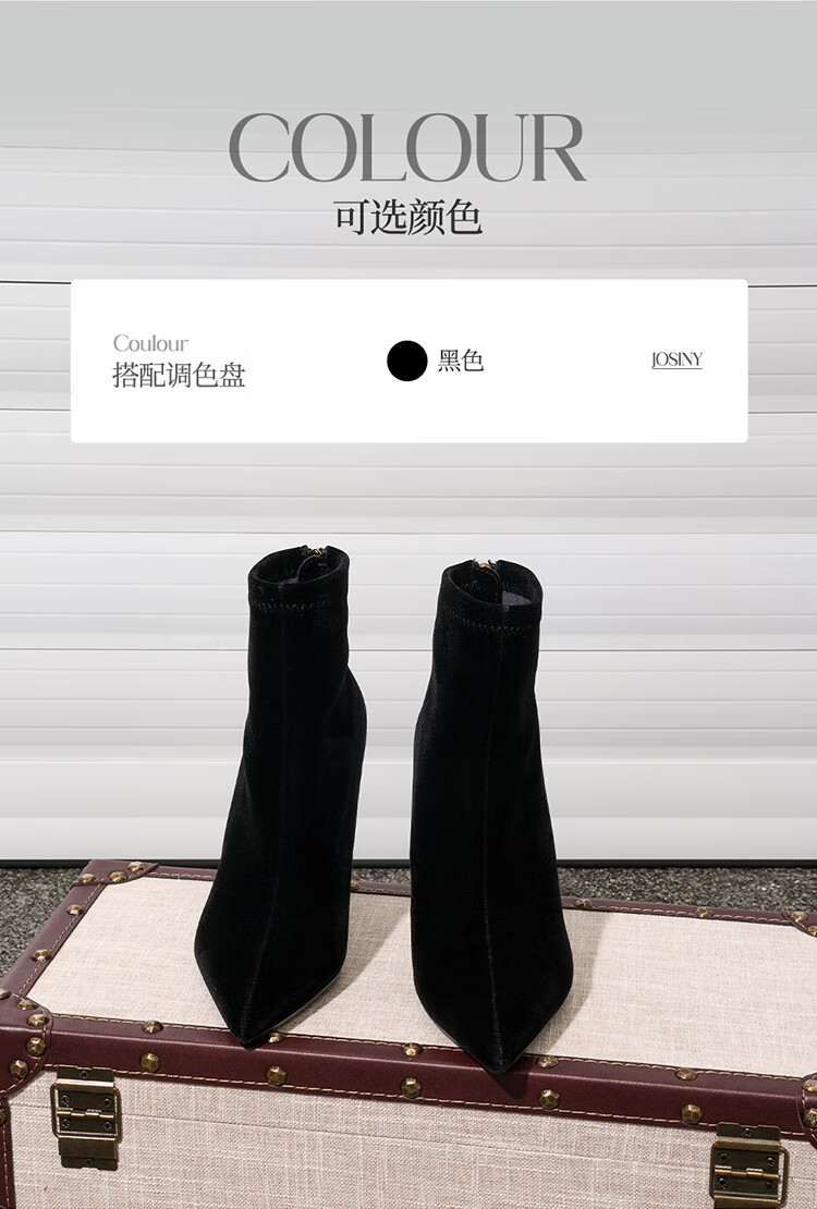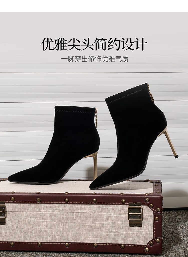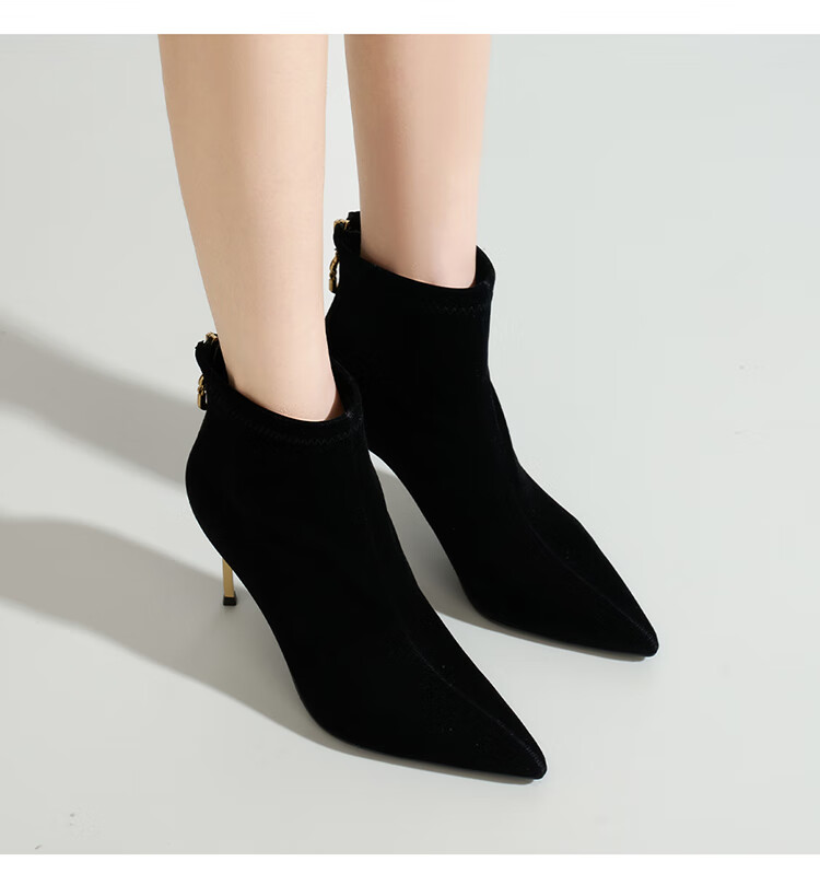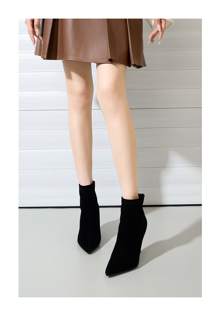 卓诗尼绒面法式弹力袜靴女2025秋季新款尖头细高跟短靴瘦瘦靴 黑色 39