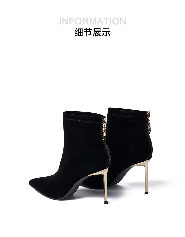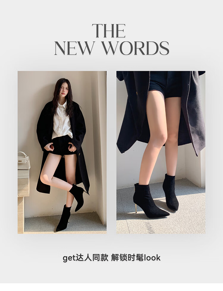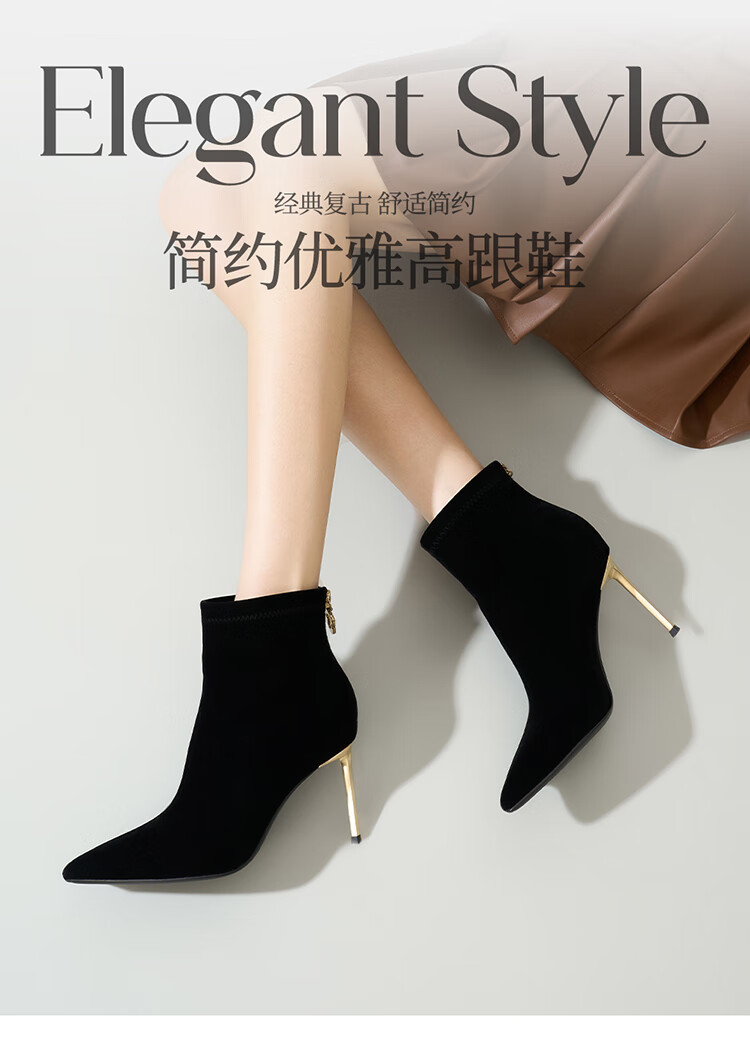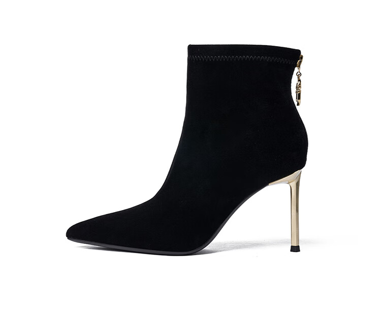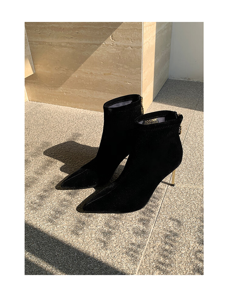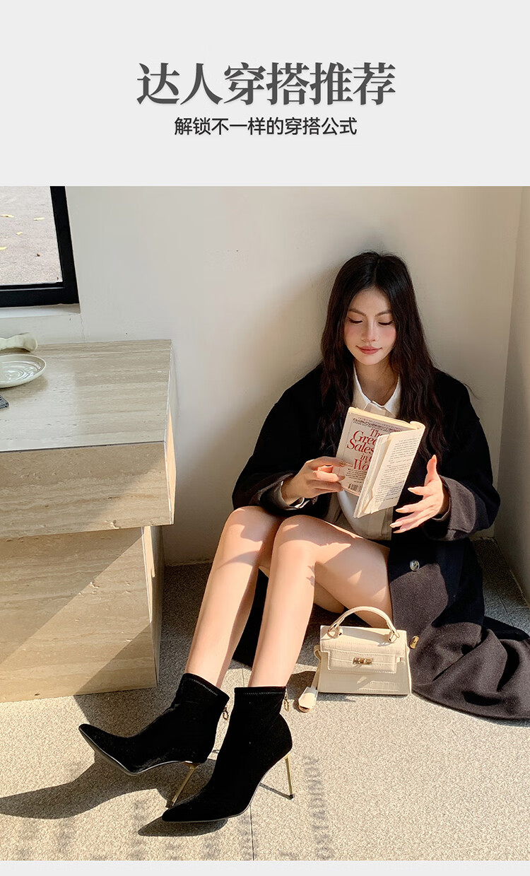 卓诗尼绒面法式弹力袜靴女2025秋季新款尖头细高跟短靴瘦瘦靴 黑色 39