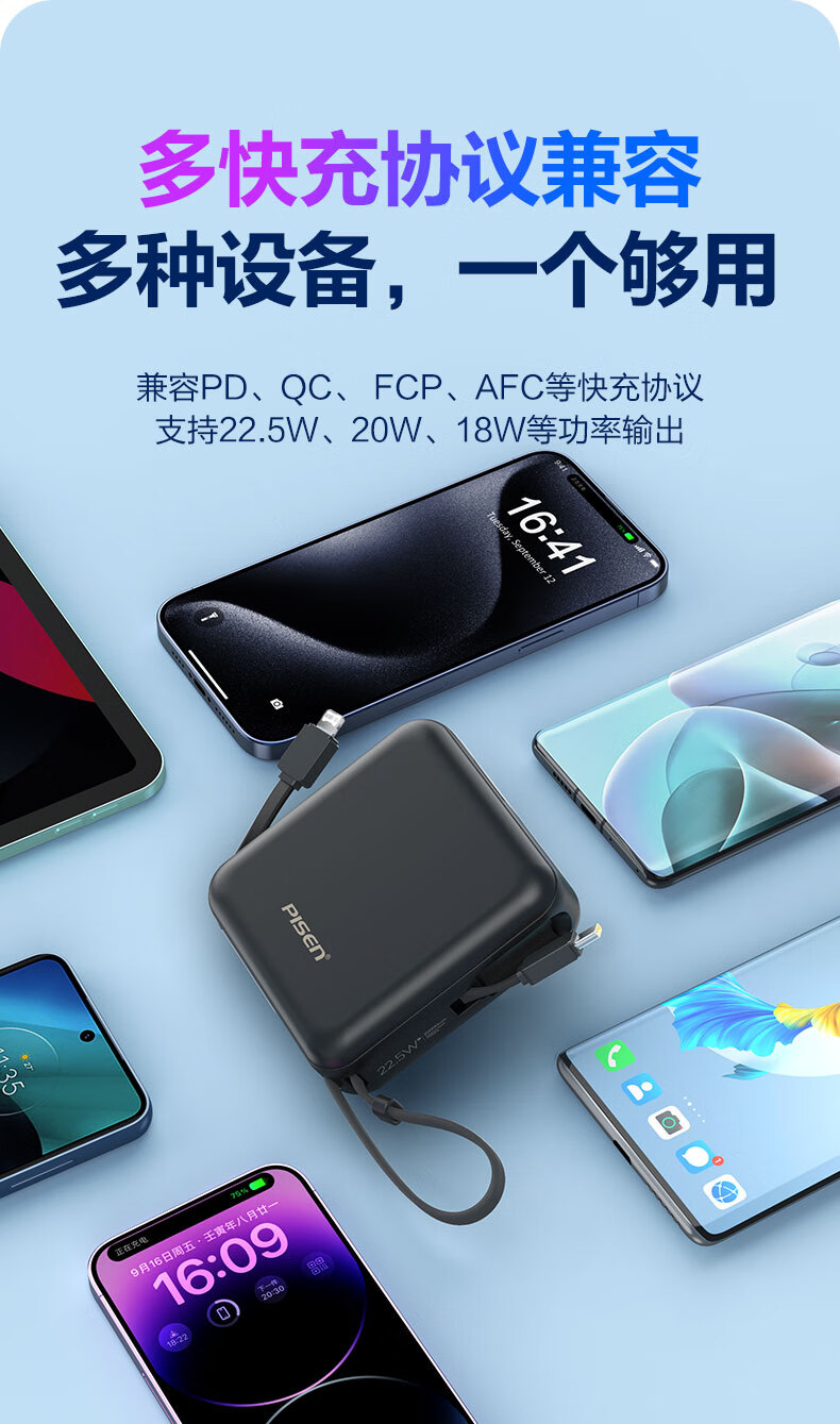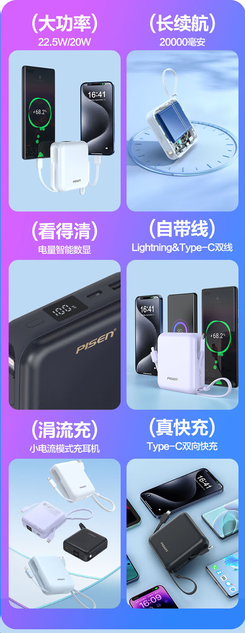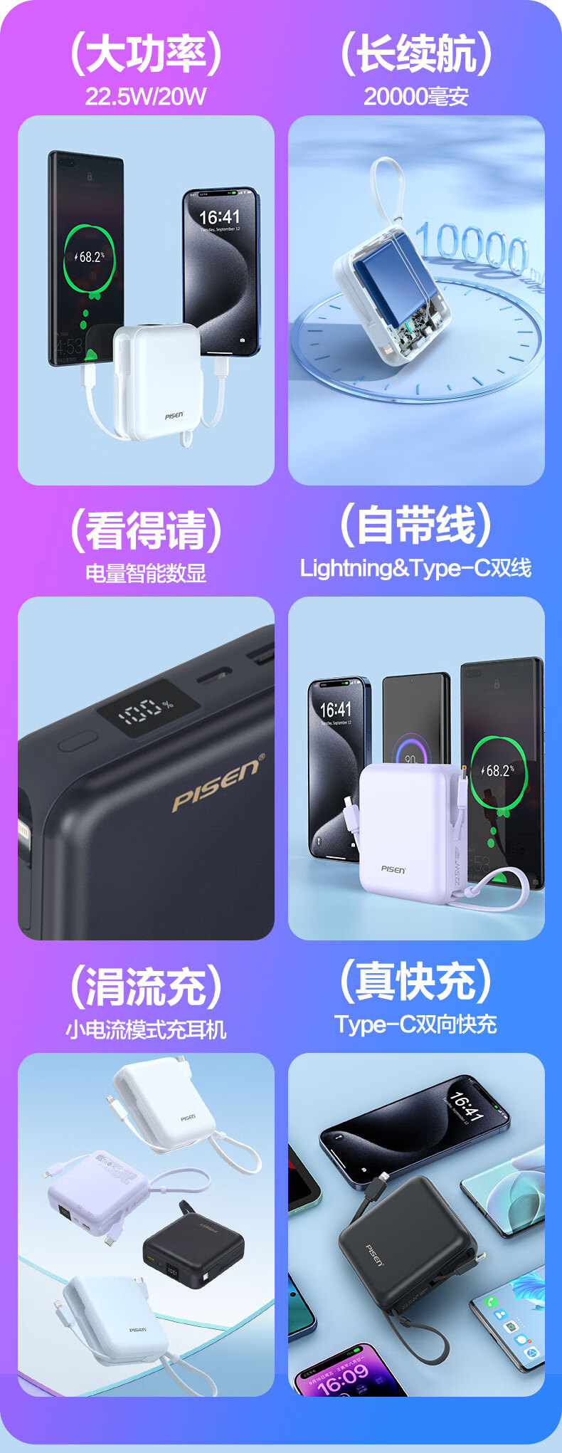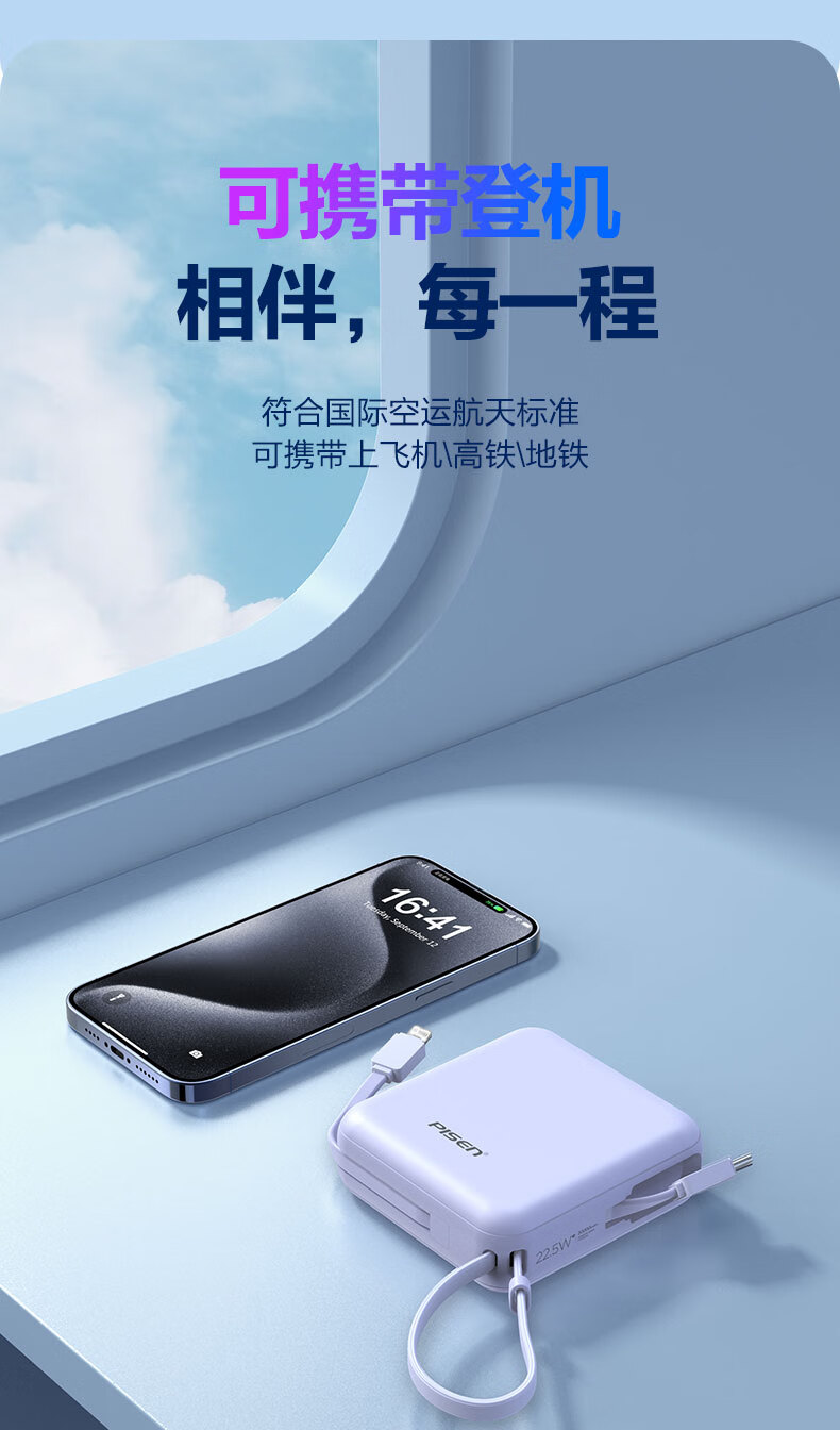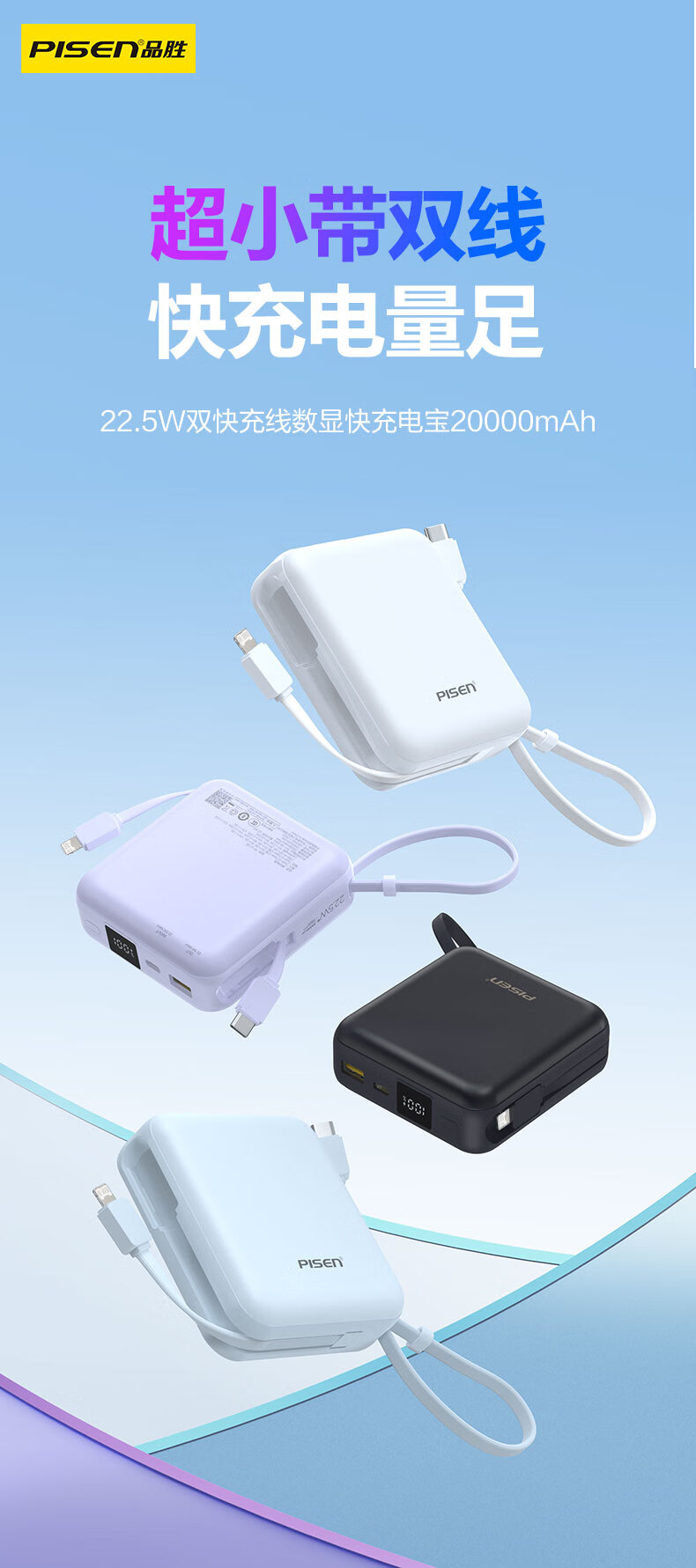品胜(PISEN)【3C认证】充电宝自带双线20000毫安大容量可上飞机高铁22.5W快充移动电源适用苹果17小米华为 紫色【小巧双线|2万毫安】