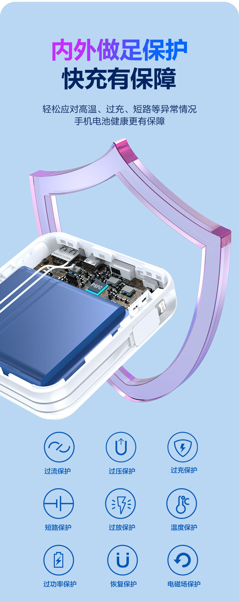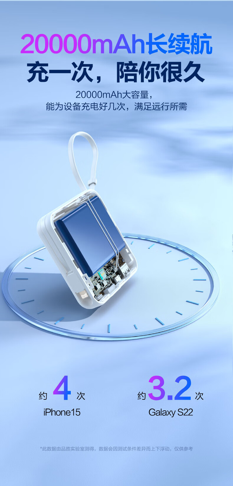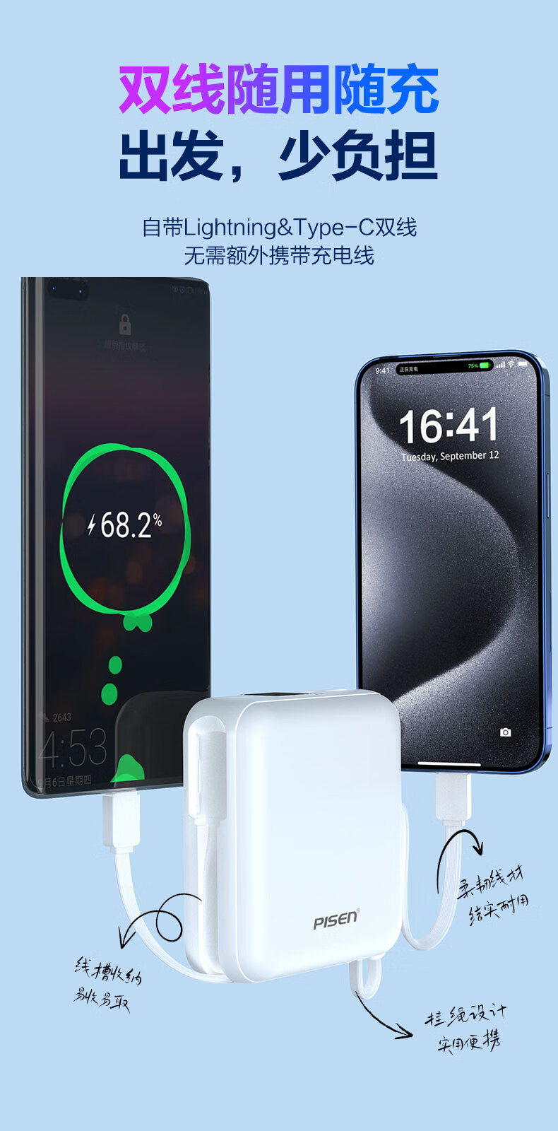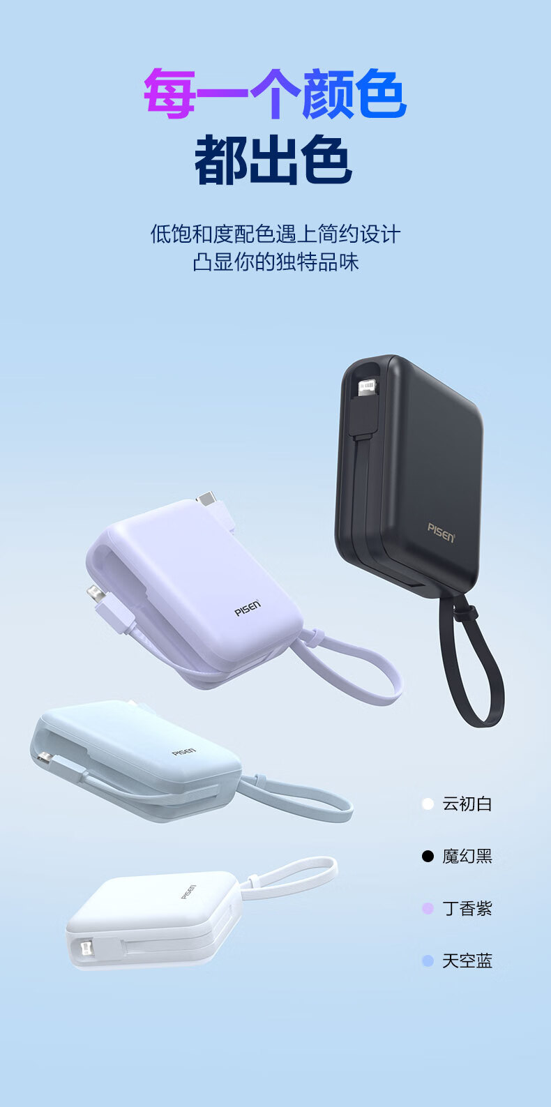 品胜(PISEN)【3C认证】充电宝自带双线20000毫安大容量可上飞机高铁22.5W快充移动电源适用苹果17小米华为 紫色【小巧双线|2万毫安】