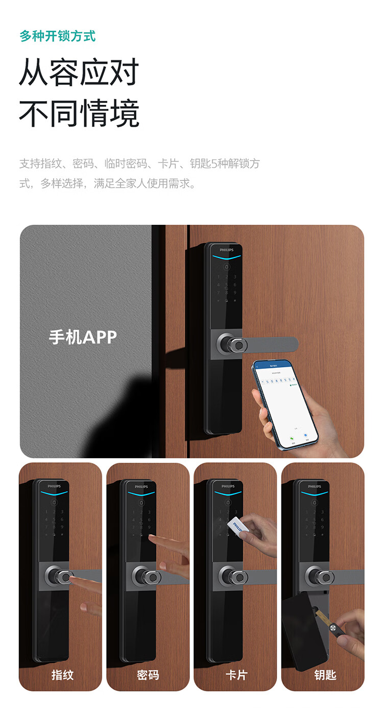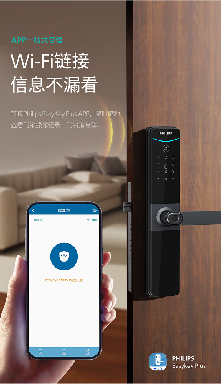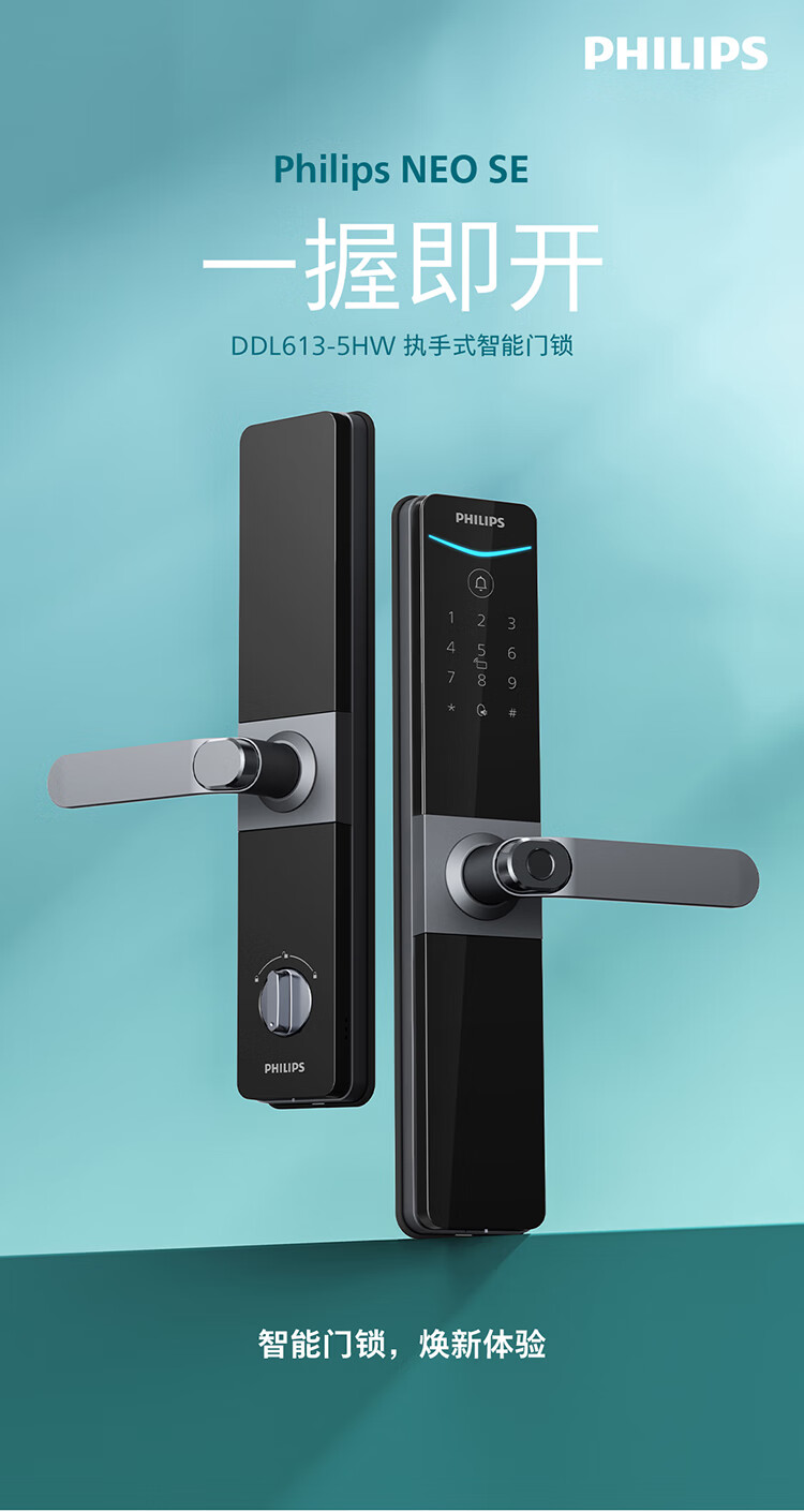 飞利浦613执手款智能门锁指纹锁入户门防盗密码锁 C级锁芯APP智控电子锁 613-W【执手式指纹锁】
