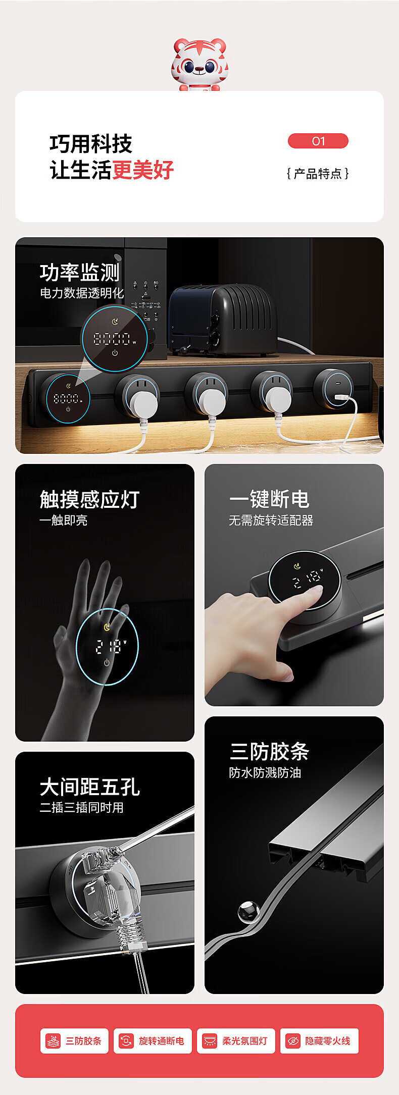 国际电工滑动轨道插座可移动电力大间距五孔插座带LED氛围灯USB适配器 黑色-大间距五孔【环形灯款】