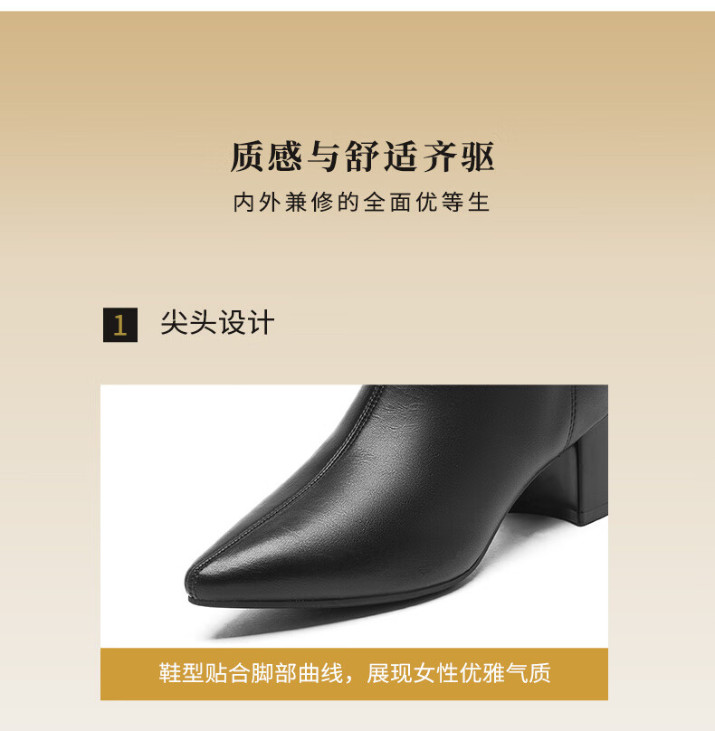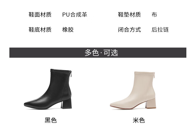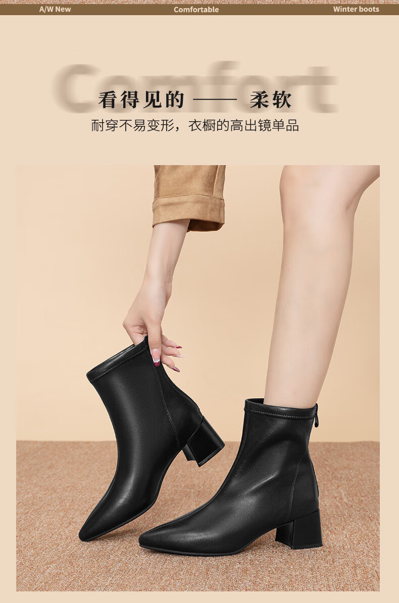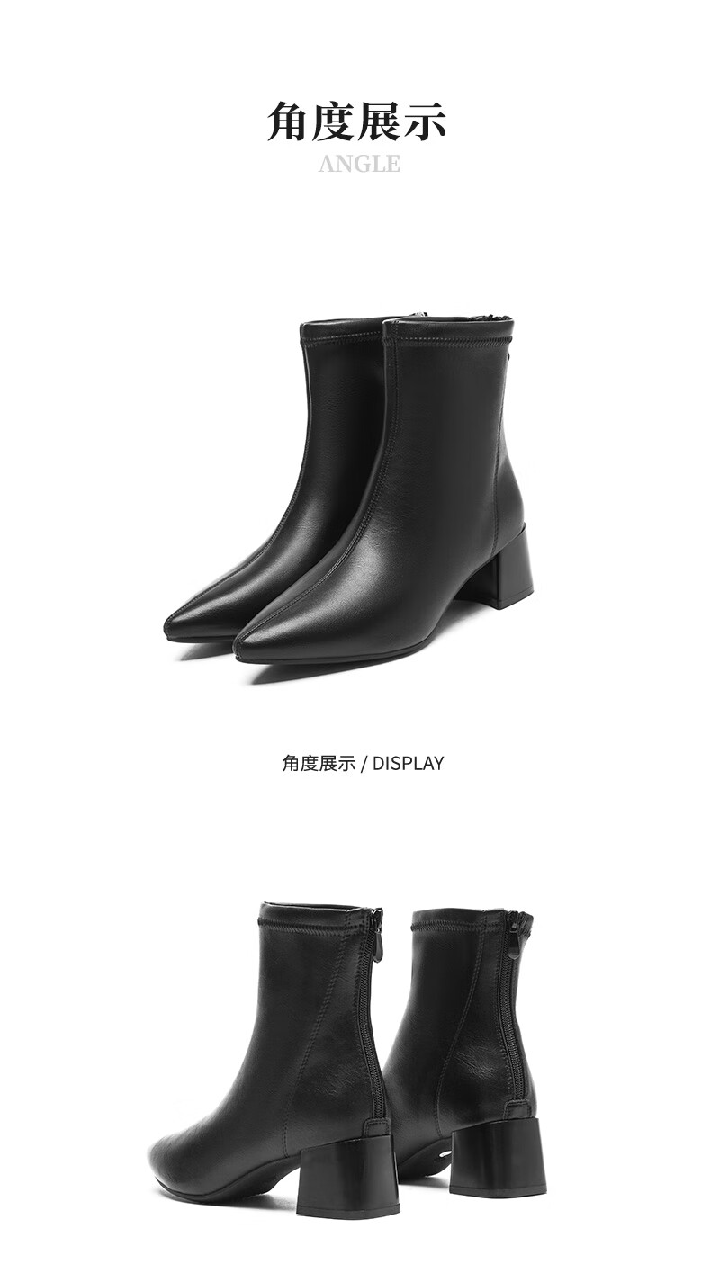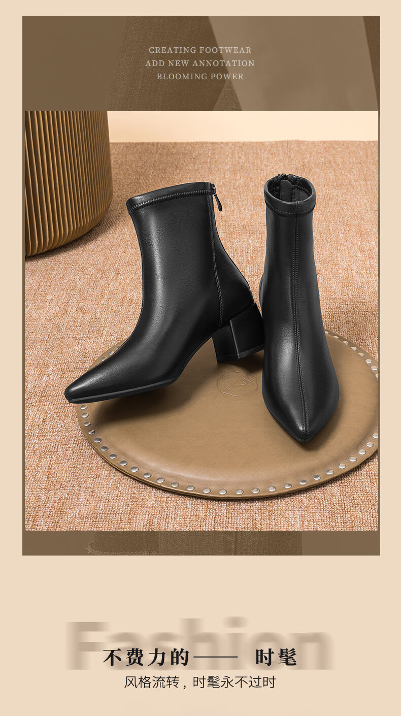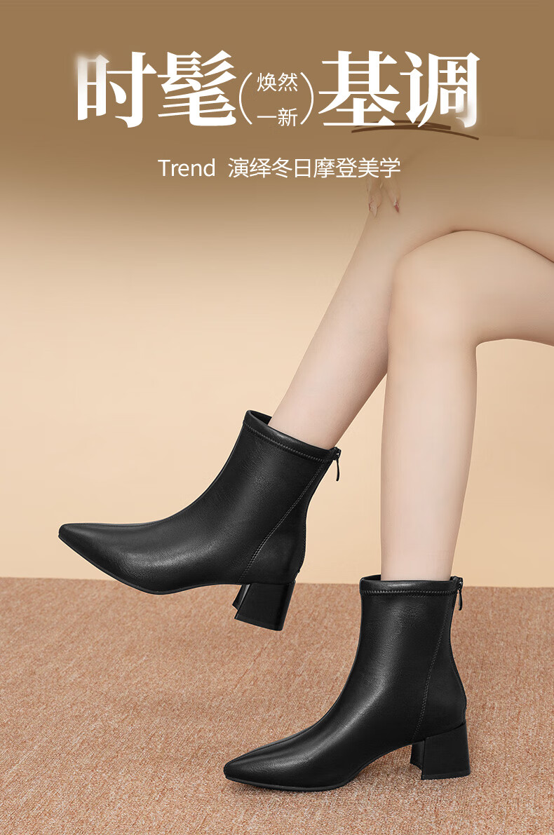 大东时装靴女鞋2025冬季新款休闲优雅粗跟后拉链尖头中跟鞋0006A 黑色 34