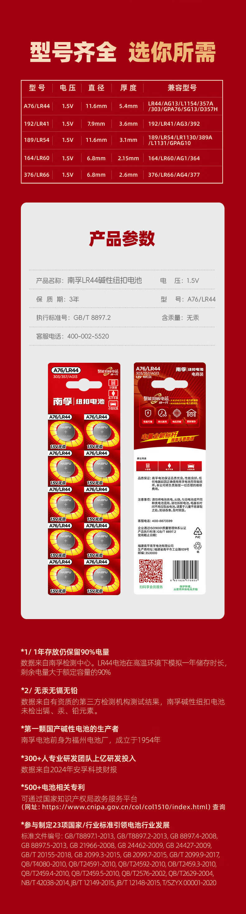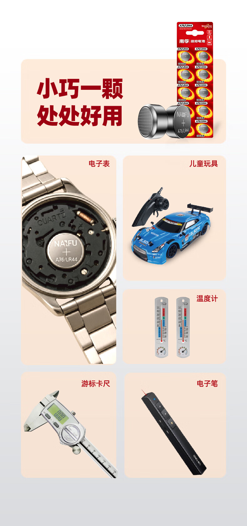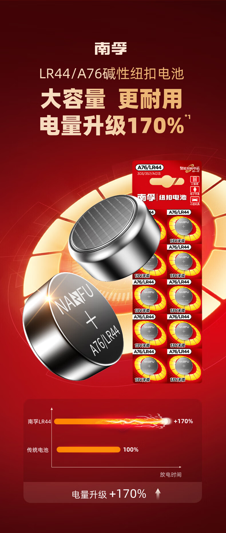 南孚纽扣电池10粒LR44/AG13/A76/L1154/357A/手表电池/计算器电池/电子玩具电池