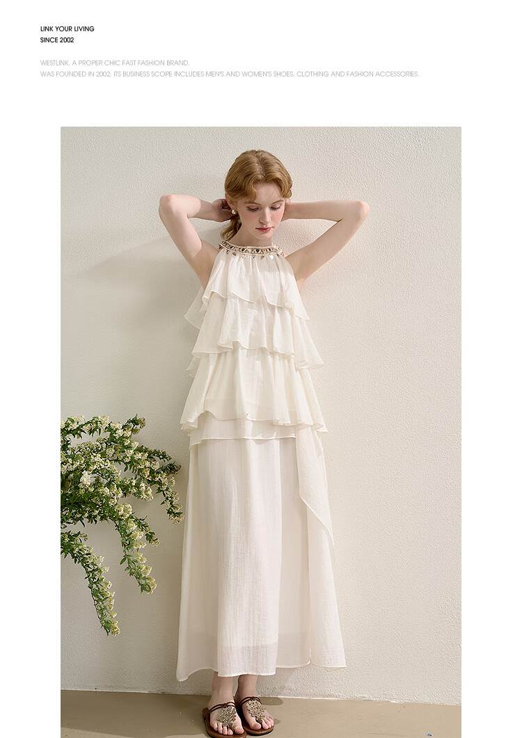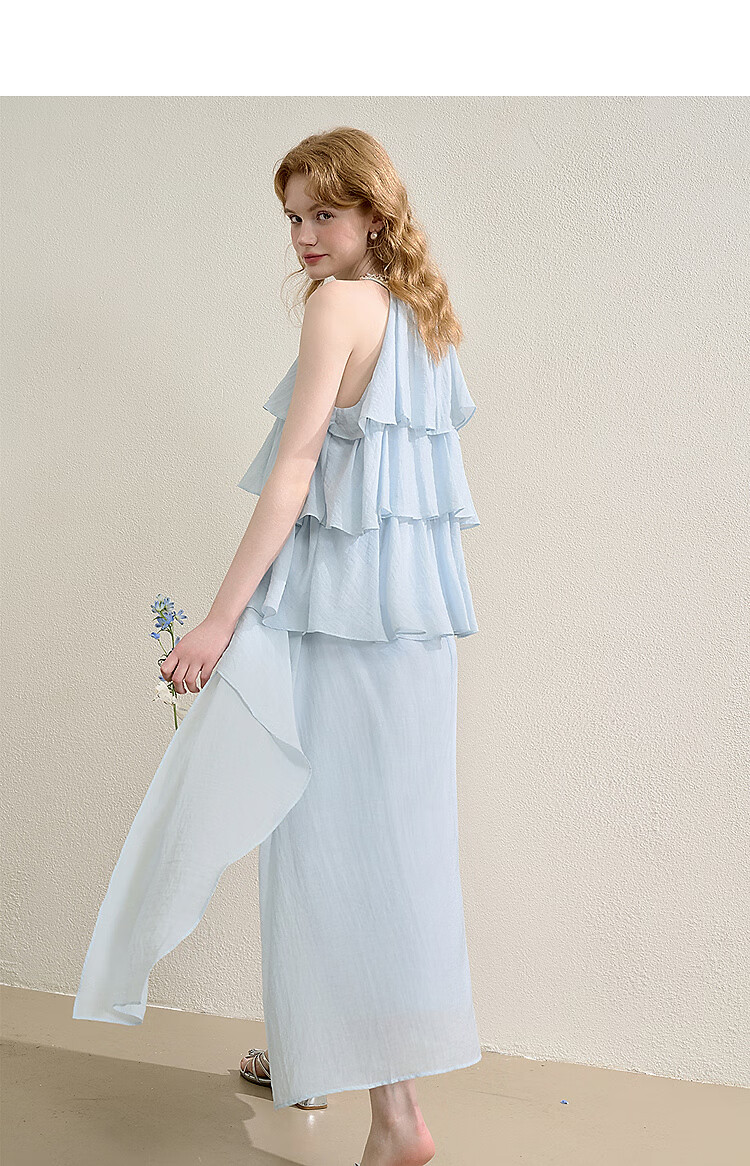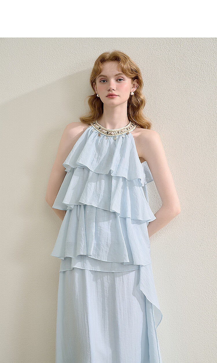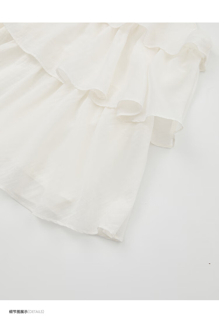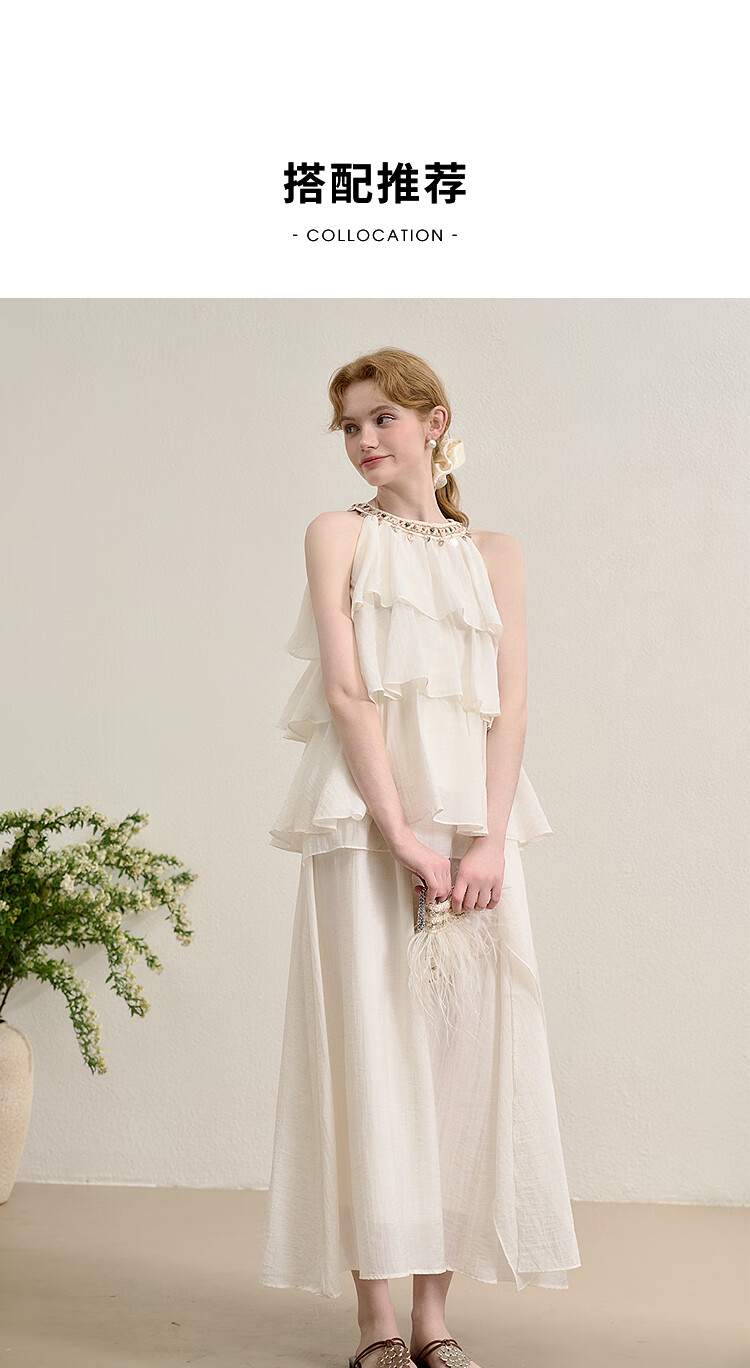 西遇法式度假风荷叶边套装女2025夏季钉珠挂脖衬衫搭半裙两件套 米白色 M (160)