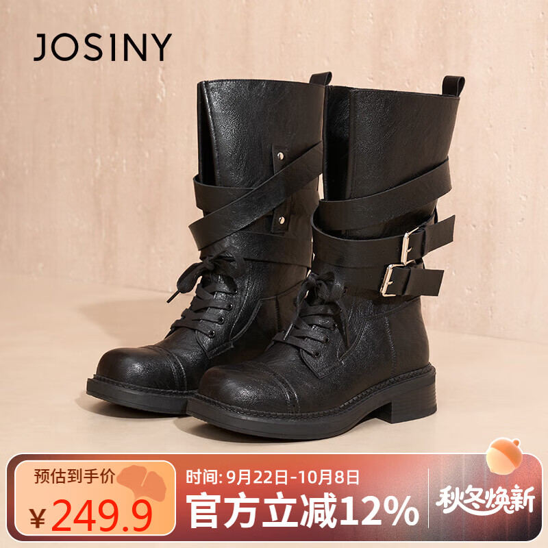 卓诗尼英伦风皮带扣骑士靴2025新款冬圆头系带套筒中筒靴马丁靴 黑色 38