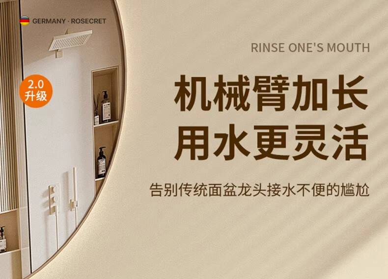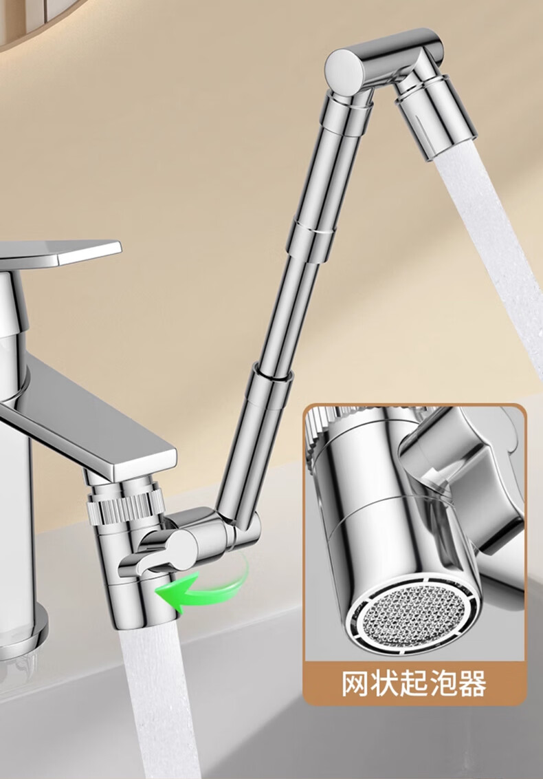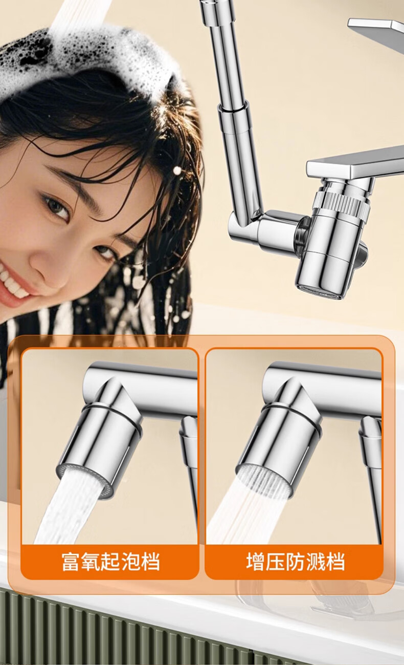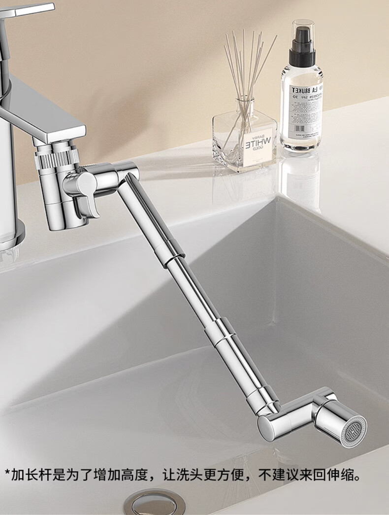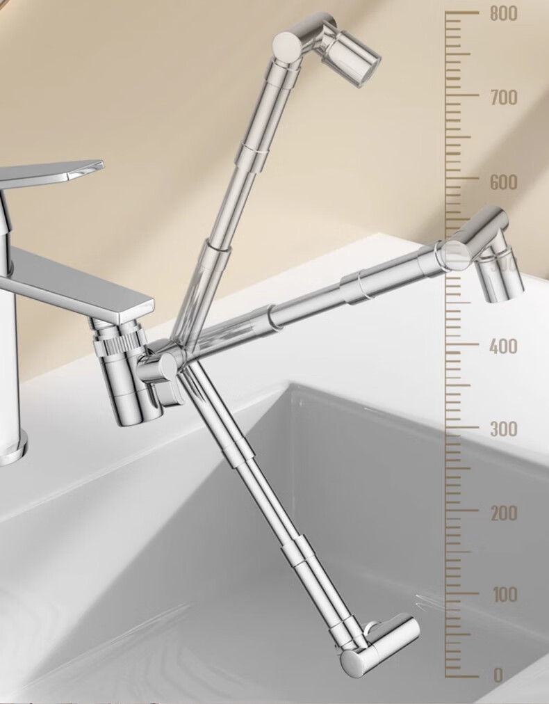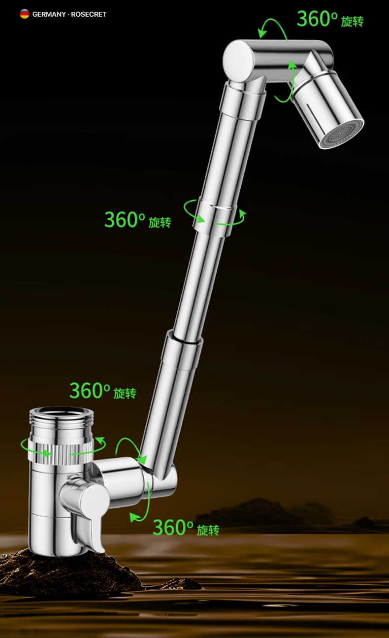 Rosecret【德国】面盆水龙头延伸器万向旋转伸缩机械臂增压防溅通用转接头 加长两档水龙头起泡器【亮银色】 通用安装丨一进二出洗头神器