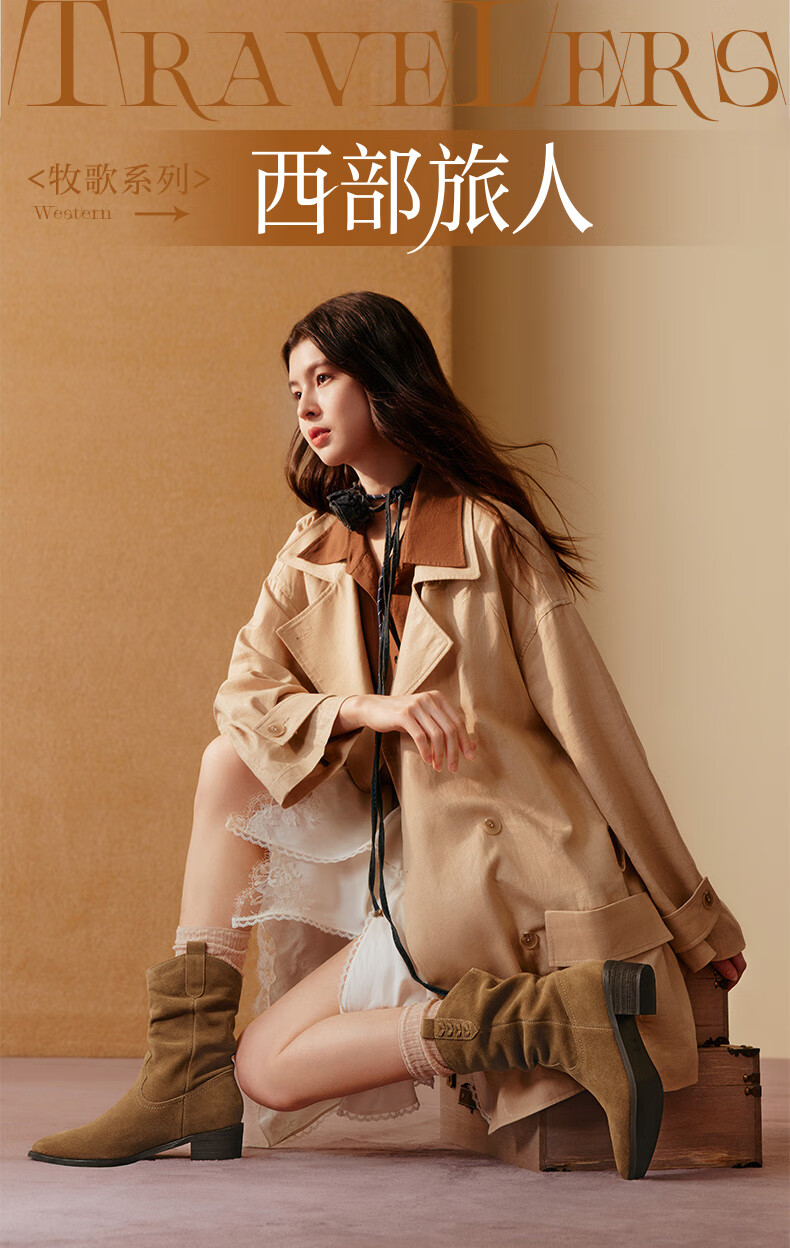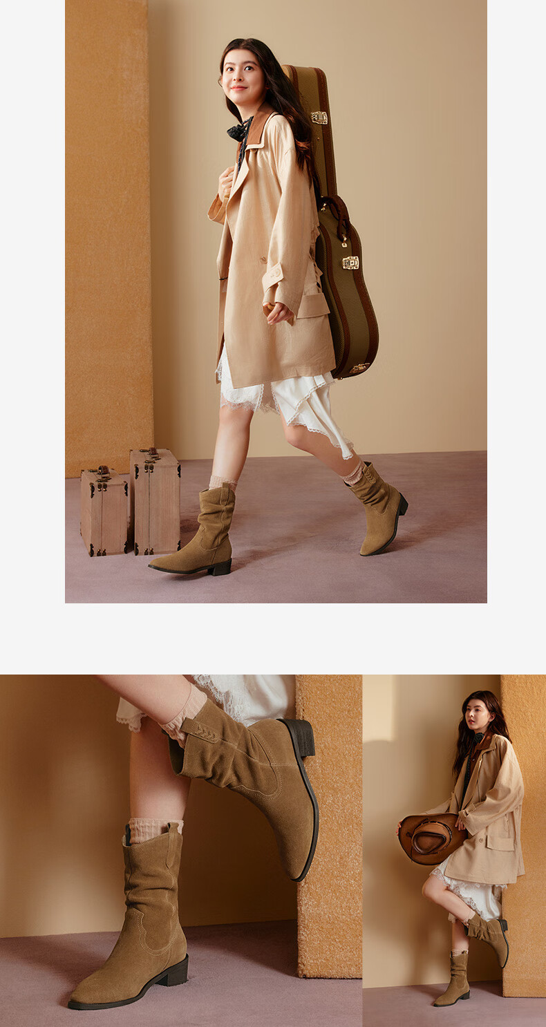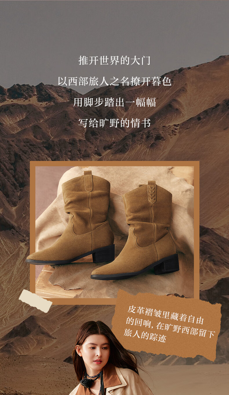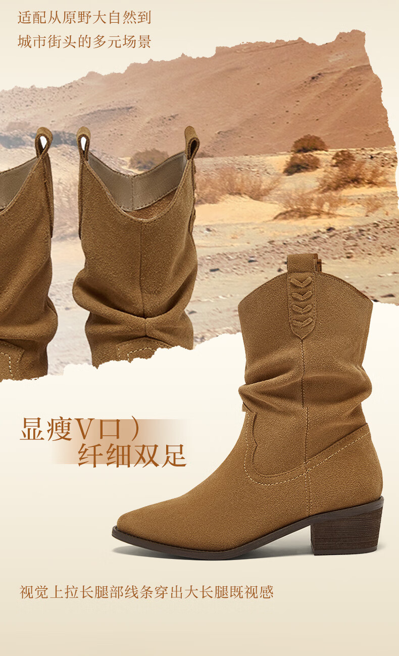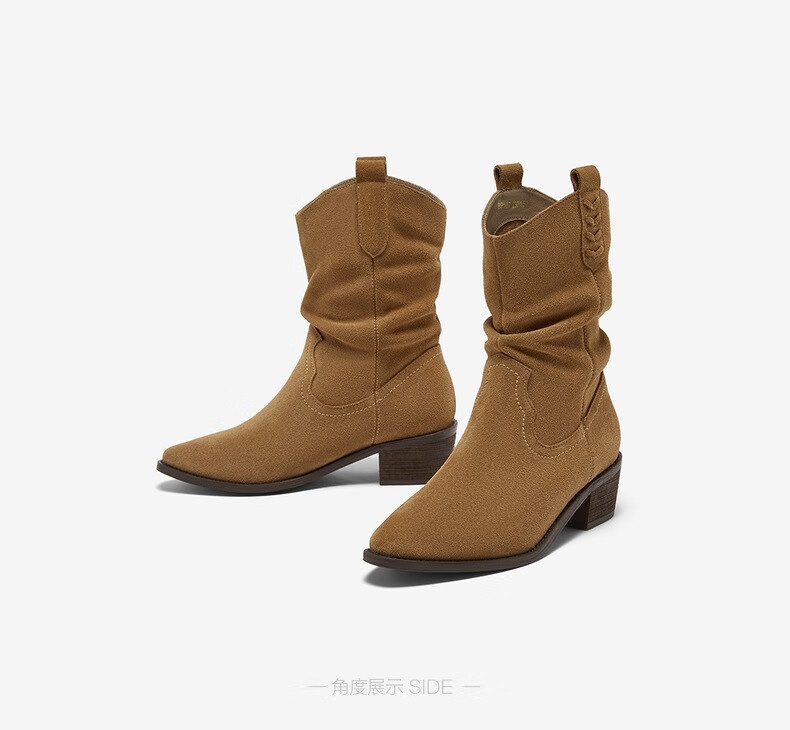 百思图【张碧晨同款】西部旅人25冬新款美拉德西部牛仔堆堆短靴女 驼色 38