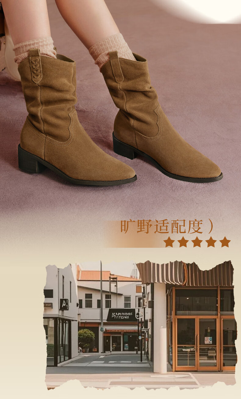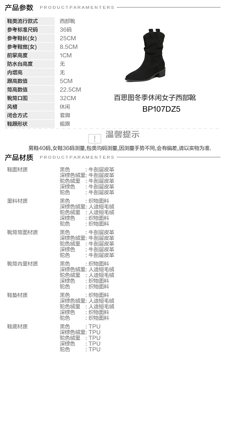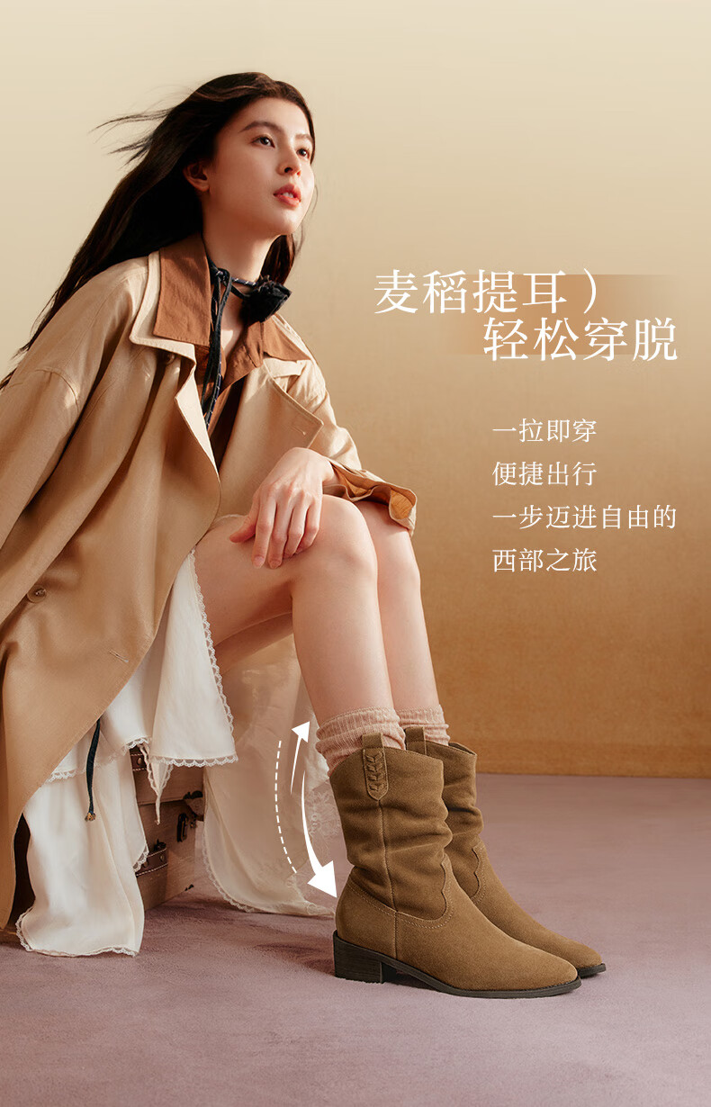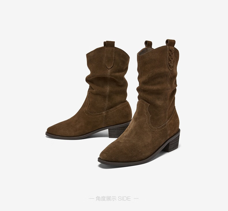 百思图【张碧晨同款】西部旅人25冬新款美拉德西部牛仔堆堆短靴女 驼色 38